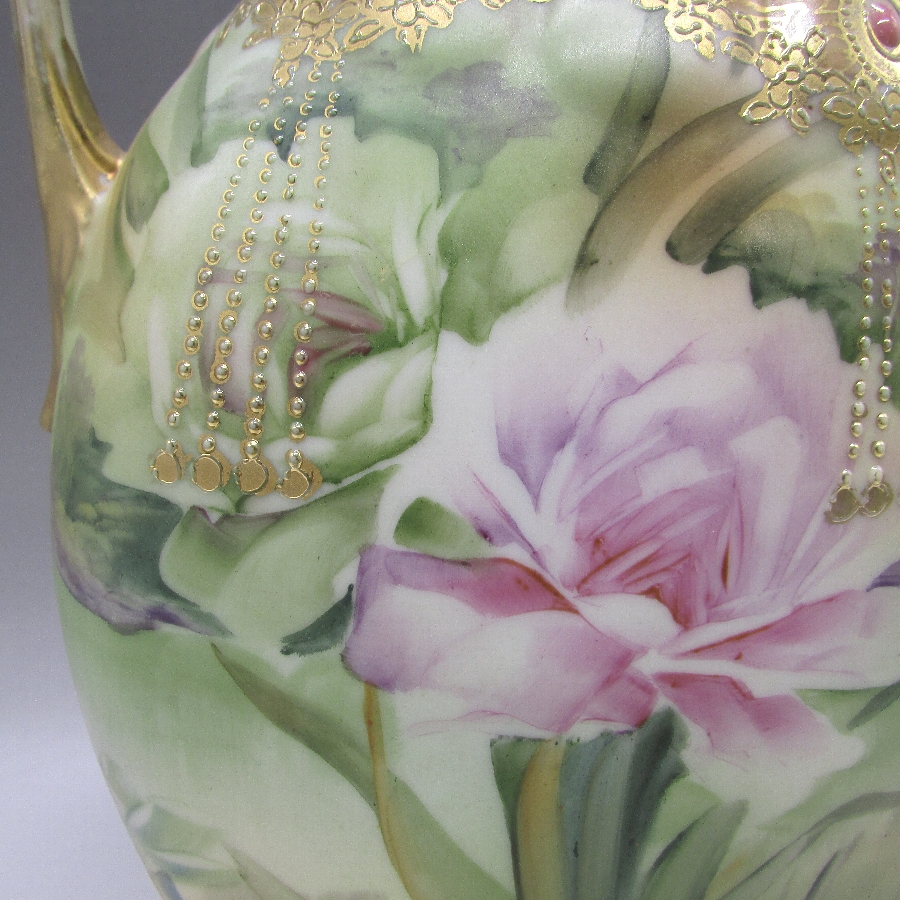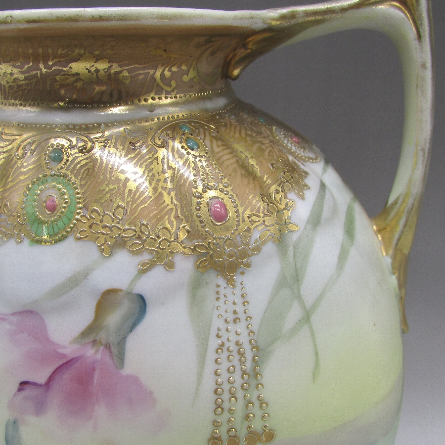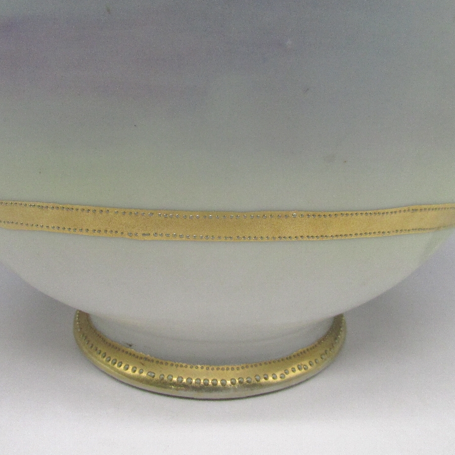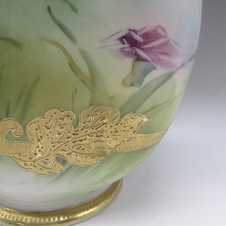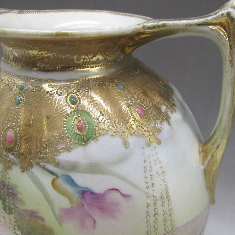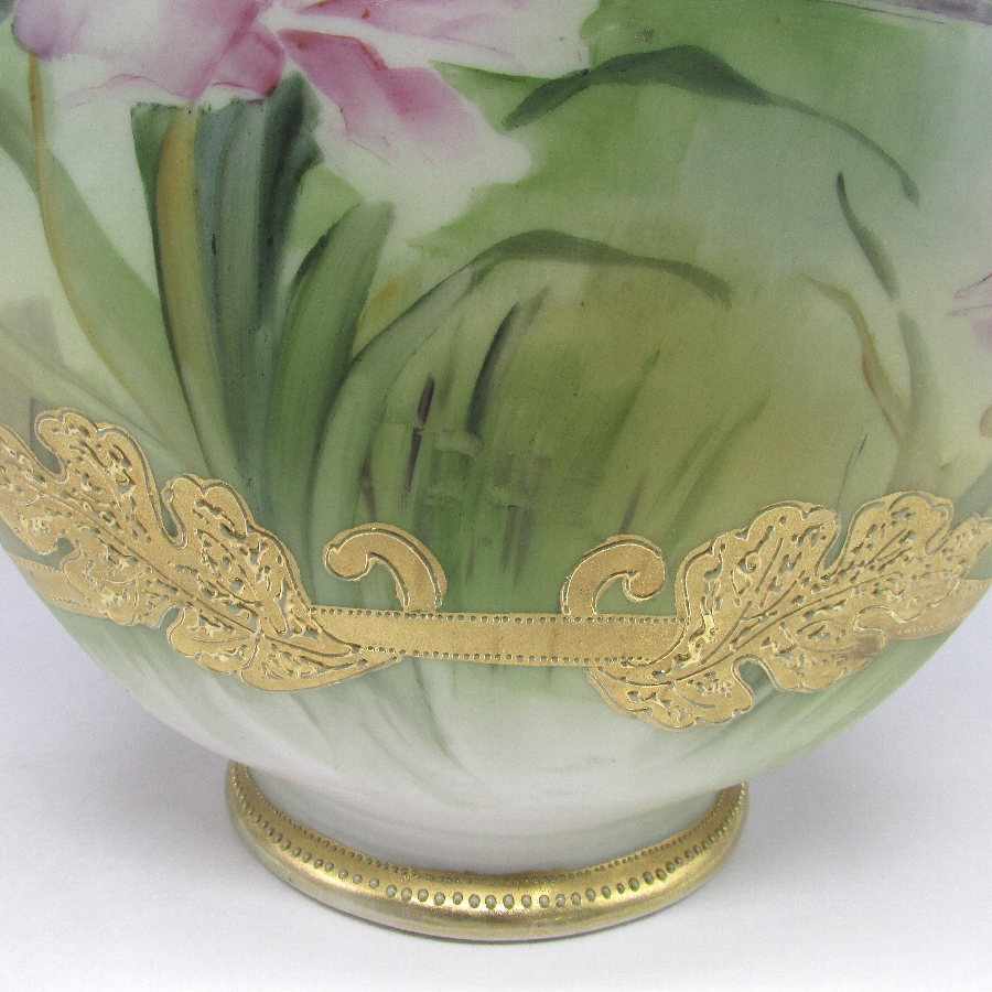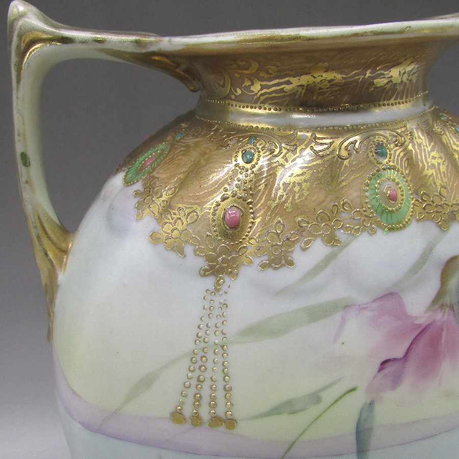 オールドノリタケのジュール湖畔風景花文花瓶です。1891年頃~1915年頃にアメリカに輸出され、約100年の時を経て日本に里帰りしてきました。湖畔を背景に花を描き、周囲を金盛り装飾で仕上げた素晴らしい作品です。金盛り装飾は高級品の代表的な装飾技法で、点、点線、線などを泥漿で描き、焼成した後に金液を筆などで塗り被せて仕上げる技法です。欧米で人気のあった豪華絢爛な仕上がりにするのに最適な技法です。オールドノリタケでよく用いられている金液は金の延棒を濃塩酸と濃硝酸を体積比で3対1に混ぜた溶液で溶解し液状にしたものを使用していました。