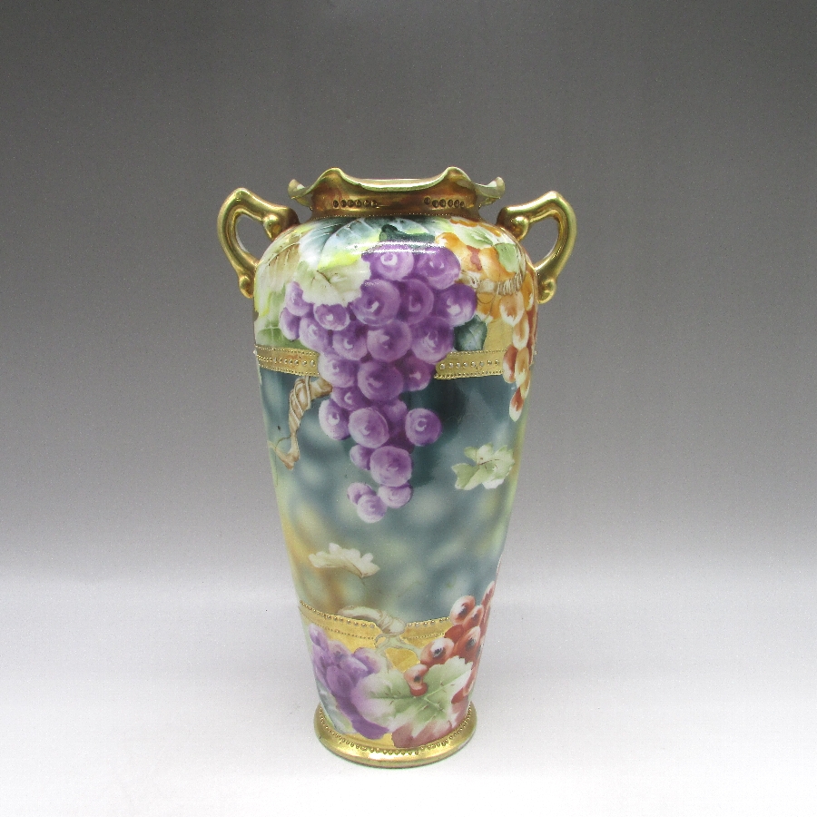 オールドノリタケの金彩葡萄文花瓶です。1891年頃~1915年頃にアメリカに輸出され、約100年の時を経て日本に里帰りしてきました。オールドノリタケは現在のノリタケカンパニーが明治末期から戦前までに製造したアンティーク陶磁器の総称です。豪華絢爛な西洋風絵付け陶磁器は海外で人気を博しました。近年では、約100年という長い歳月を経て日本に里帰りしてきたことで、わが国でも大変人気が高くなっており、美術工芸品として高い地位を確保しつつあります。