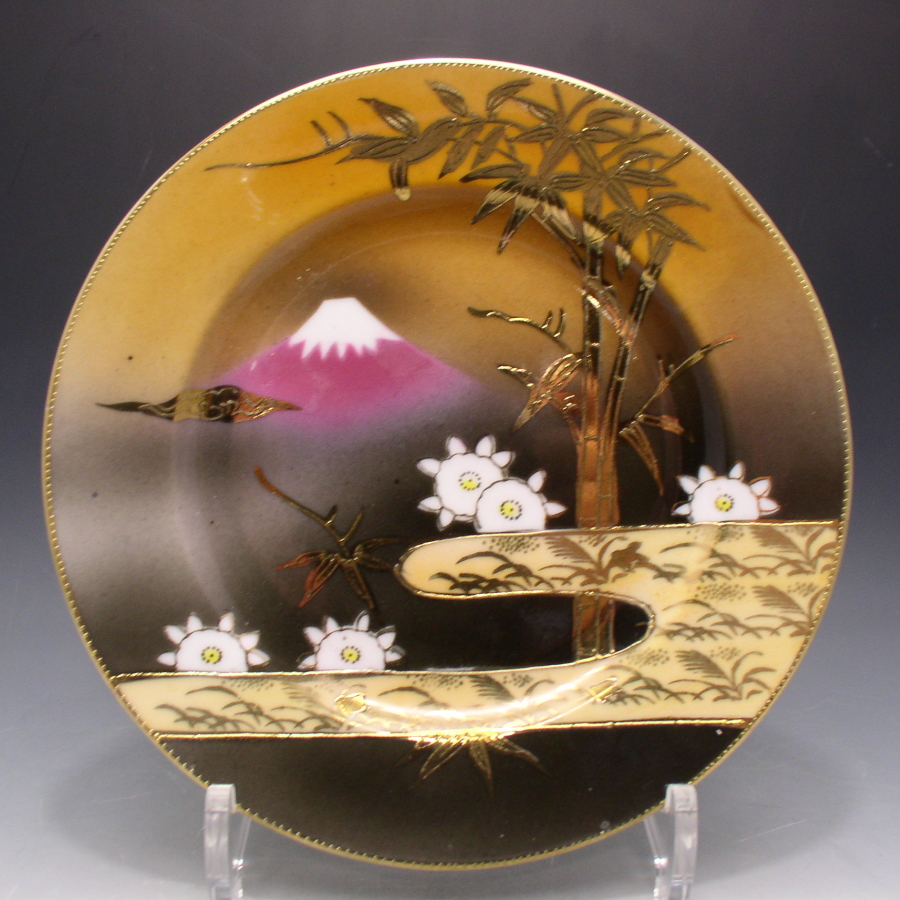 志水禄之助が主に欧米諸国向けに作陶した山麓湖畔風景文プレートです。志水禄之助とは優れた絵付技術で会社再建をした名画工です。明治30年代~40年代初期の問屋です。初めは、瀧籐商店に勤めていたが、1892年頃にヴァンタイン商会が名古屋に出張所を設けたのをきっかけに、当時の貿易物の輸出不況とあいまって、瀧籐商店を辞め、西瓦町に志水禄之助商店を設立しました。特に瀧籐商店時代の1883年頃に倒産の危機に直面した会社を再建した優れた絵付け技術を持つ名画工です。裏印はイニシャルR.Sと日の出を組み合わせたものがあり、1940年頃までは操業していたようです。