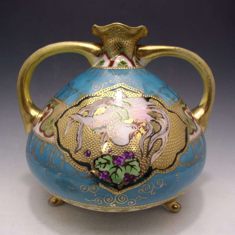 オリエンタルチャイナが主に欧米諸国向けに作陶した金盛鳥文花瓶です。オリエンタルチャイナとは森村組や日本陶器(現ノリタケカンパニーリミテッド)が明治・大正時代に主に欧米諸国に輸出していた時期と同時期に海を渡った日本製の陶磁器の総称です。資料が非常に
