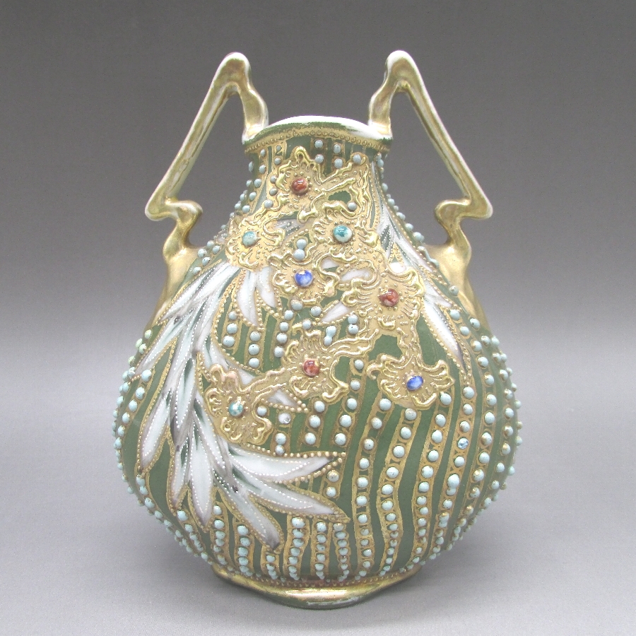 オールドノリタケの緑地先尖葉文ジュール花瓶です。1891年頃~1915年頃にアメリカに輸出され、約100年の時を経て日本に里帰りしてきました。オールドノリタケは現在のノリタケカンパニーが明治末期から戦前までに製造したアンティーク陶磁器の総称です。豪華絢爛な西洋風絵付け陶磁器は海外で人気を博しました。近年では、約100年という長い歳月を経て日本に里帰りしてきたことで、わが国でも大変人気が高くなっており、美術工芸品として高い地位を確保しつつあります。