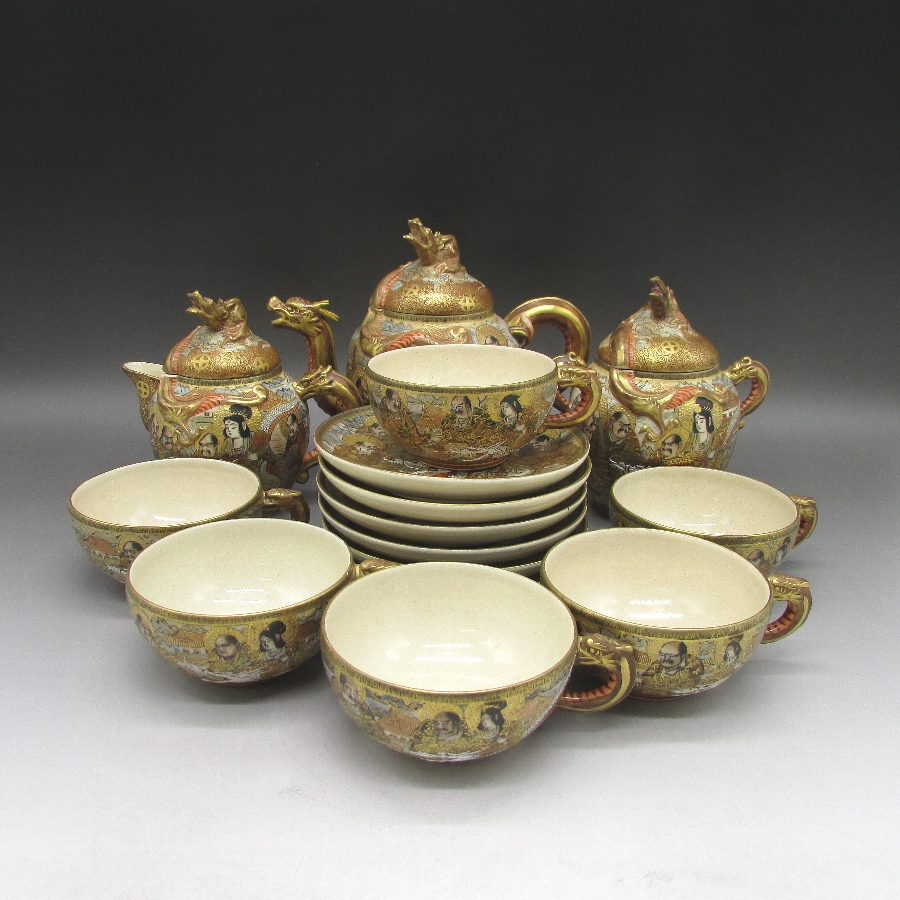 薩摩焼 楠部 錦手人物文龍盛上洋茶器揃