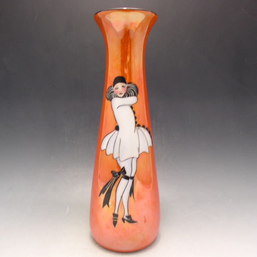 開国150周年記念展-帰ってきた陶磁器たち-」(2004・オールドノリタケ記念展実行委員会)のP126、「オールド・ノリタケのアール・デコ」(井谷善惠/2008・平凡社)のP22に同作品が掲載されています。アールデコ時代に流行した貴婦人をモティーフにした作品です。「愛らしく、明るい雰囲気」が特徴的で、特に人気の高いシリーズで「デコレディ」と呼ばれています。貴婦人は様々なものをモティーフにして描かれていました。ホーマー・コナント(1887年-1927年)の「マダム・ポンパドール」、ロシアの「エルテ」などが有名です。それ以外にも「ハーパス・バザール」や「ヴォーグ」といったファッション雑誌に登場する女性を参考にした作品も存在しています。アールデコは1925年にフランスのパリで開催された現代装飾産業美術国際博覧会によって呼ばれるようになった装飾様式です。東洋美術などの芸術的要素を取り入れた直線と立体のシンプルかつ合理的な機能美あるデザインで、明るく・鮮やかな色彩が特徴的です。ノリタケのアール・デコのデザインは1919年に英国人デザイナーの「シリル・シー」が入社してから本格的に始まりました。ノリタケ・アール・デコの制作は1920年頃から1929年の世界恐慌までのわずか10年間程度の制作期間しかなく、未だにその全貌は明らかにされていません。