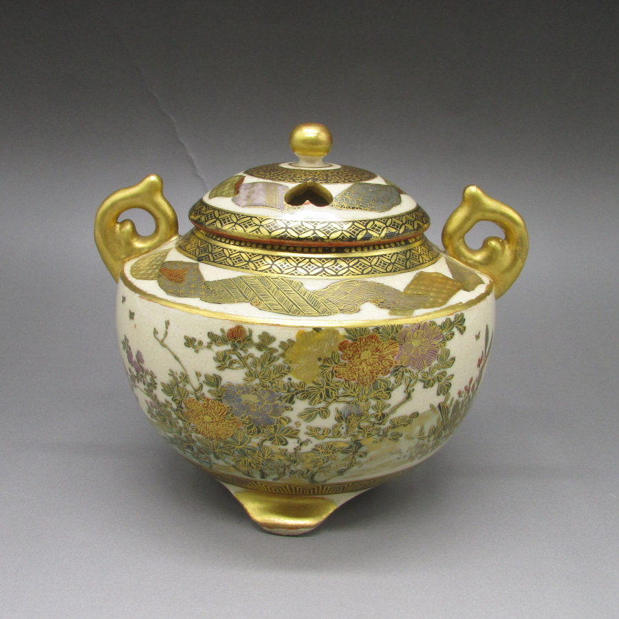 薩摩焼(銘:善光山)が海外向けに作陶した錦手草花蝶文香炉です。薩摩焼は明治時代に欧米で「極東の宝石」と評され、日本の陶磁器の人気に火を付けました。陶磁器を有望な輸出品として認識した政府は、様々な政策を講じて輸出の後押しをした結果、日本各地で作陶され様々な発展を遂げていきました。