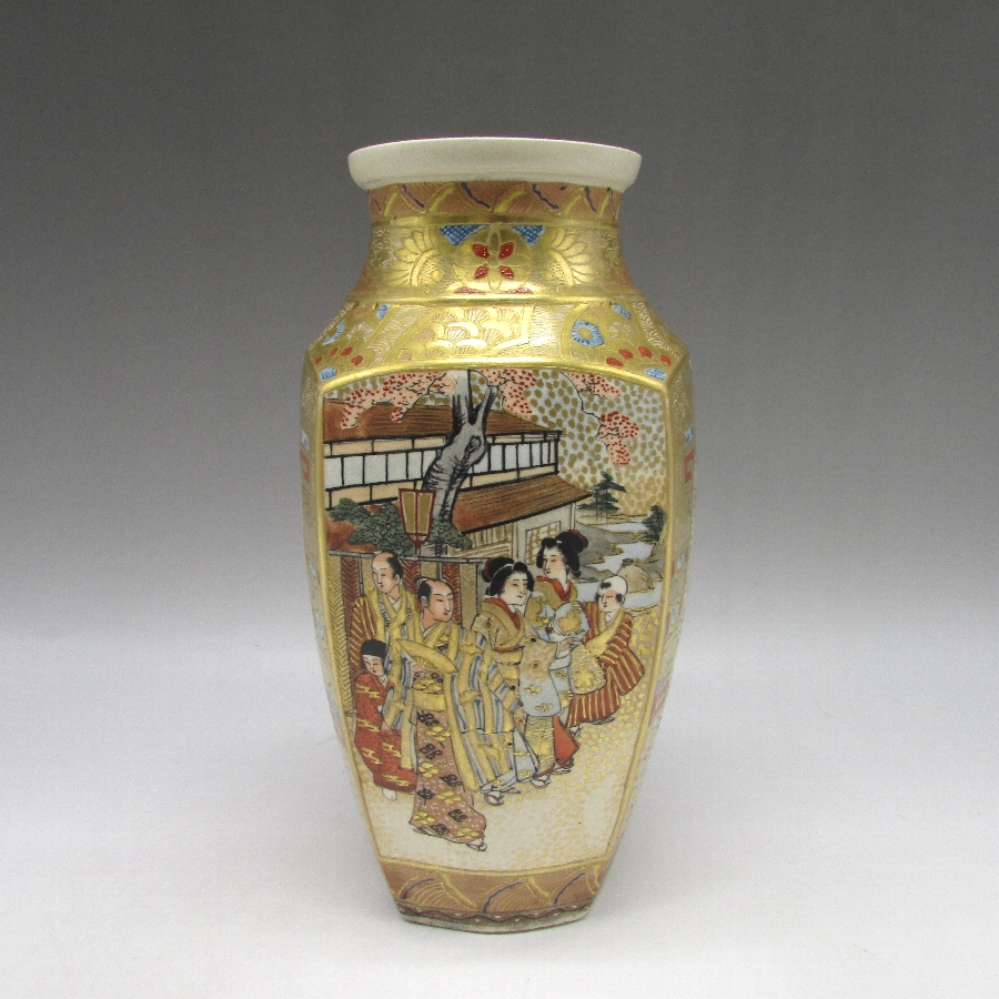 薩摩焼 保土田 金襴手草花人物風景文四面花瓶