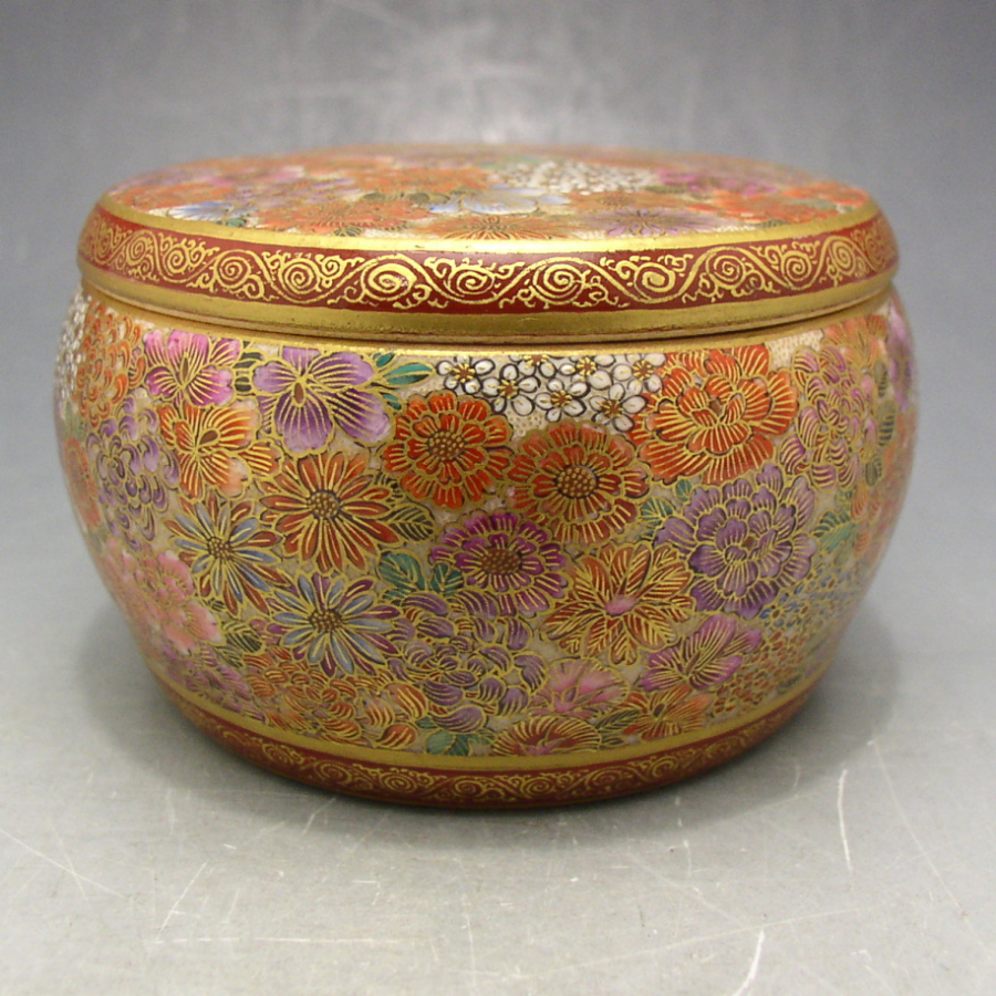薩摩焼(銘:輝山)が海外向けに作陶した錦手菊花文香合です。薩摩焼は明治時代に欧米で「極東の宝石」と評され、日本の陶磁器の人気に火を付けました。陶磁器を有望な輸出品として認識した政府は、様々な政策を講じて輸出の後押しをした結果、日本各地で作陶され様々な発展を遂げていきました。