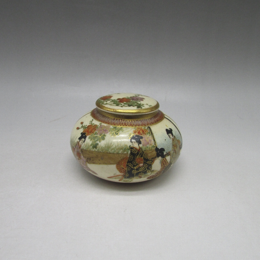 薩摩焼(銘:まるに)が海外向けに作陶した錦手草花人物文香合です。薩摩焼は明治時代に欧米で「極東の宝石」と評され、日本の陶磁器の人気に火を付けました。陶磁器を有望な輸出品として認識した政府は、様々な政策を講じて輸出の後押しをした結果、日本各地で作陶され様々な発展を遂げていきました。