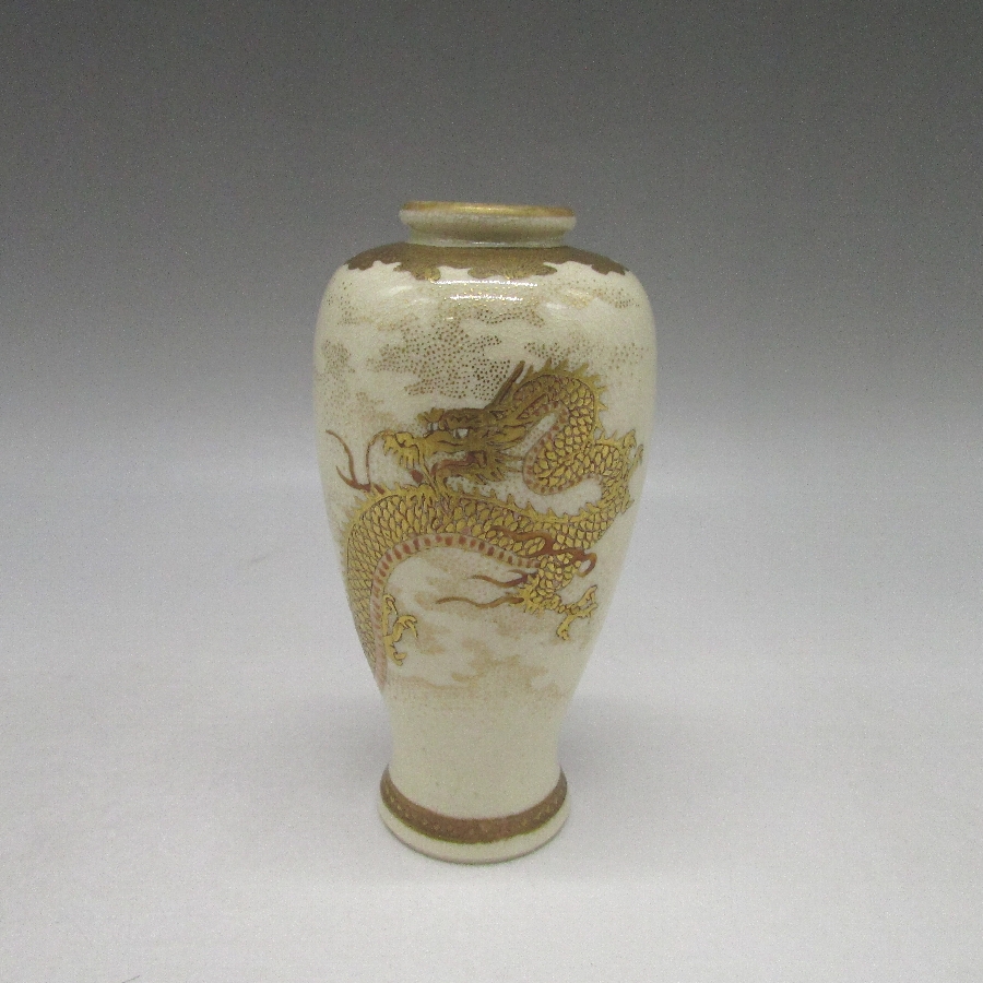 薩摩焼(銘:朝山)が海外向けに作陶した龍文花瓶です。薩摩焼は明治時代に欧米で「極東の宝石」と評され、日本の陶磁器の人気に火を付けました。陶磁器を有望な輸出品として認識した政府は、様々な政策を講じて輸出の後押しをした結果、日本各地で作陶され様々な発展を遂げていきました。