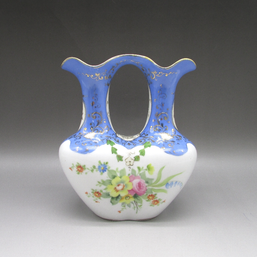オールドノリタケの花文二挿付花瓶です。1911年頃~1921年頃にアメリカに輸出され、約100年の時を経て日本に里帰りしてきました。オールドノリタケは現在のノリタケカンパニーが明治末期から戦前までに製造したアンティーク陶磁器の総称です。豪華絢爛な西洋風絵付け陶磁器は海外で人気を博しました。近年では、約100年という長い歳月を経て日本に里帰りしてきたことで、わが国でも大変人気が高くなっており、美術工芸品として高い地位を確保しつつあります。