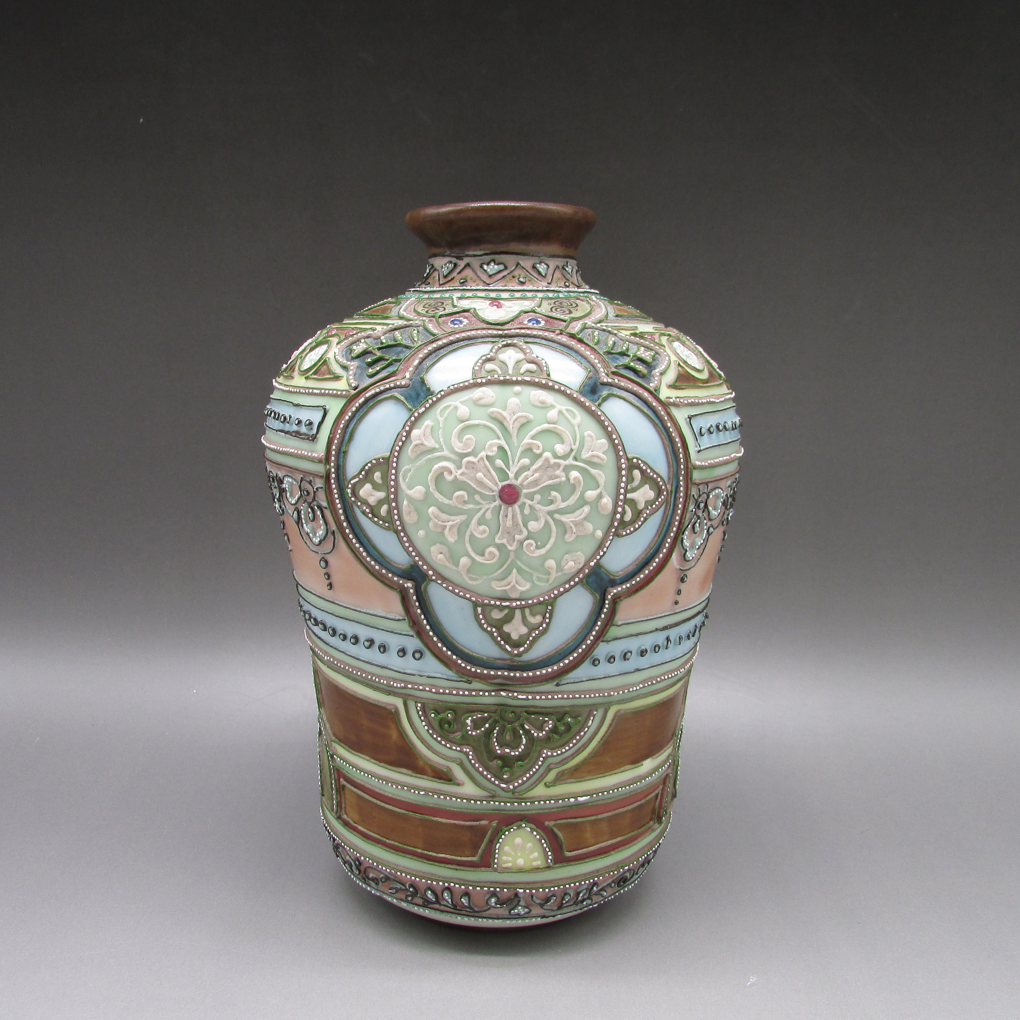 オールドノリタケの盛上草花文花瓶です。1891年頃~1915年頃にアメリカに輸出され、約100年の時を経て日本に里帰りしてきました。オールドノリタケは現在のノリタケカンパニーが明治末期から戦前までに製造したアンティーク陶磁器の総称です。豪華絢爛な西洋風絵付け陶磁器は海外で人気を博しました。近年では、約100年という長い歳月を経て日本に里帰りしてきたことで、わが国でも大変人気が高くなっており、美術工芸品として高い地位を確保しつつあります。