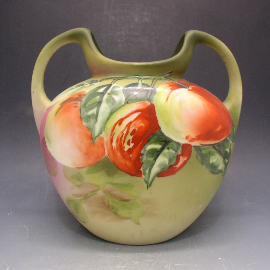 オールドノリタケの桃文把手付花瓶です。1891年頃~1915年頃にアメリカに輸出され、約100年の時を経て日本に里帰りしてきました。オールドノリタケは現在のノリタケカンパニーが明治末期から戦前までに製造したアンティーク陶磁器の総称です。豪華絢爛な西洋風絵付け陶磁器は海外で人気を博しました。近年では、約100年という長い歳月を経て日本に里帰りしてきたことで、わが国でも大変人気が高くなっており、美術工芸品として高い地位を確保しつつあります。