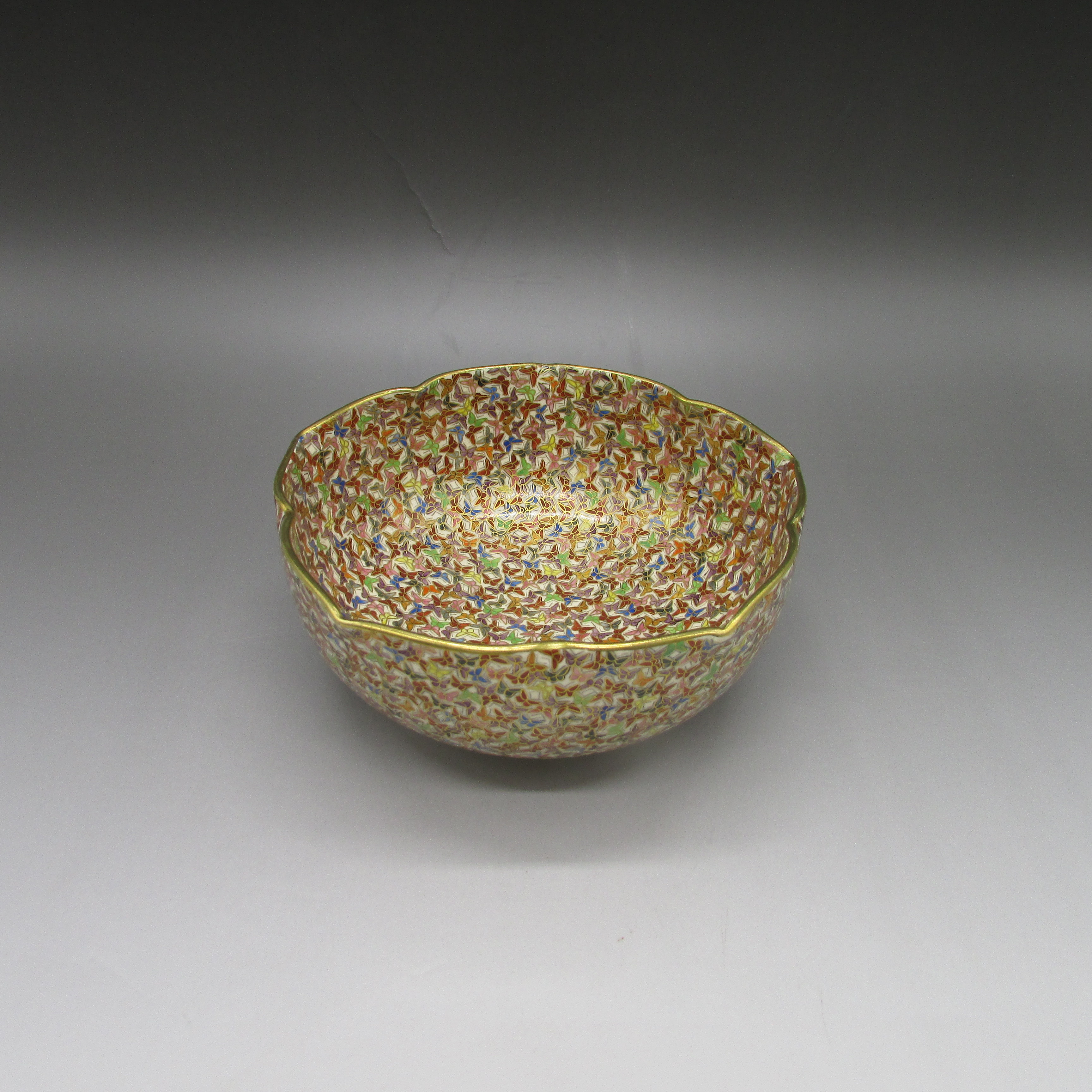 薩摩焼(銘:玉山)が海外向けに作陶した蝶文菓子器です。薩摩焼は明治時代に欧米で「極東の宝石」と評され、日本の陶磁器の人気に火を付けました。陶磁器を有望な輸出品として認識した政府は、様々な政策を講じて輸出の後押しをした結果、日本各地で作陶され様々な発展を遂げていきました。
