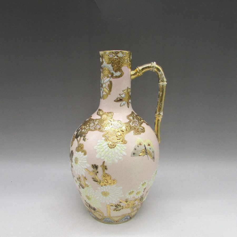 薩摩焼(銘:錦光山)が海外向けに作陶した桃地白花風景図花瓶です。薩摩焼は明治時代に欧米で「極東の宝石」と評され、日本の陶磁器の人気に火を付けました。陶磁器を有望な輸出品として認識した政府は、様々な政策を講じて輸出の後押しをした結果、日本各地で作陶され様々な発展を遂げていきました。