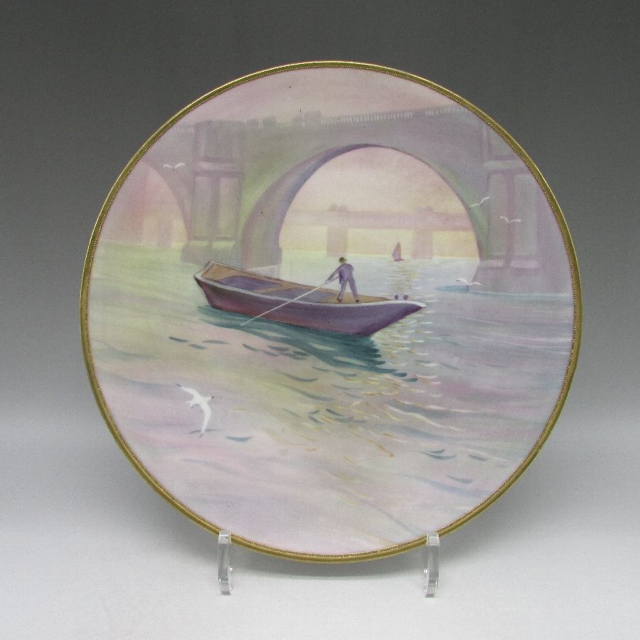オールドノリタケの夕焼釣船風景文飾皿です。1911年頃~1921年頃にアメリカに輸出され、約100年の時を経て日本に里帰りしてきました。「VAN