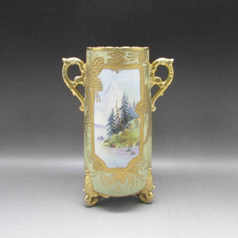 オールドノリタケの金盛風景文花瓶です。1911年頃~1921年頃にアメリカに輸出され、約100年の時を経て日本に里帰りしてきました。「オールドノリタケ