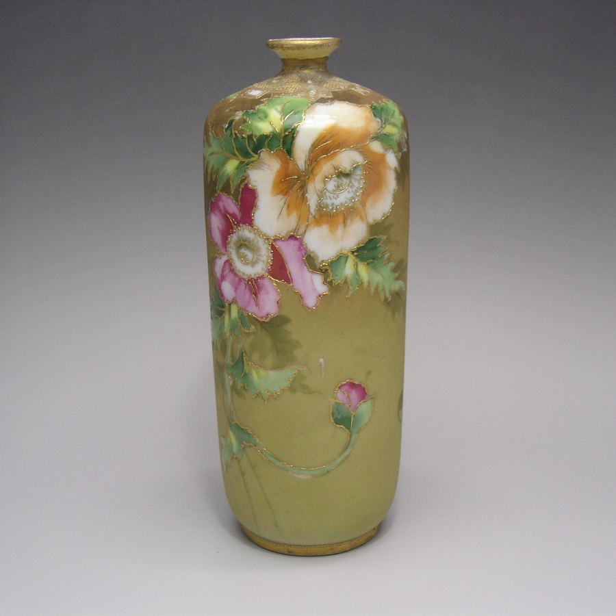 オールドノリタケの金彩花文花瓶です。1911年頃~1921年頃にアメリカに輸出され、約100年の時を経て日本に里帰りしてきました。花は日本の職人にとって、最も得意とする分野であり、西洋と日本のデザインを融合させた独特な雰囲気の美を創り上げています。