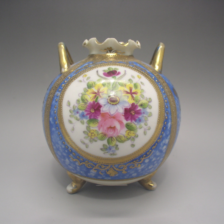 オールドノリタケの金彩薔薇文把手付花瓶です。1906年頃~1925年頃にイギリスに輸出され、約100年の時を経て日本に里帰りしてきました。オールドノリタケは現在のノリタケカンパニーが明治末期から戦前までに製造したアンティーク陶磁器の総称です。豪華絢爛な西洋風絵付け陶磁器は海外で人気を博しました。近年では、約100年という長い歳月を経て日本に里帰りしてきたことで、わが国でも大変人気が高くなっており、美術工芸品として高い地位を確保しつつあります。