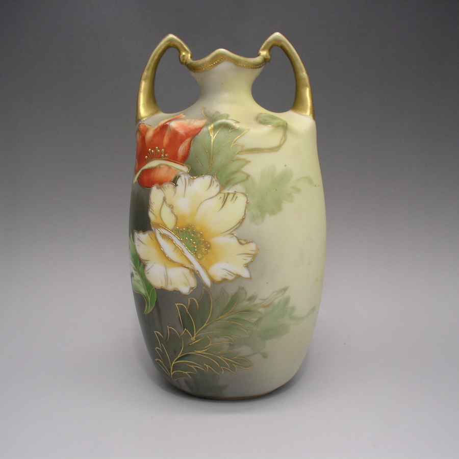 オールドノリタケの金彩赤白花文把手付花瓶です。1911年頃~1921年頃にアメリカに輸出され、約100年の時を経て日本に里帰りしてきました。シックなベース地に花を描いた幻想的な雰囲気が漂う素晴らしい作品です。花は日本の職人にとって、最も得意とする分野であり、西洋と日本のデザインを融合させた独特な雰囲気の美を創り上げています。