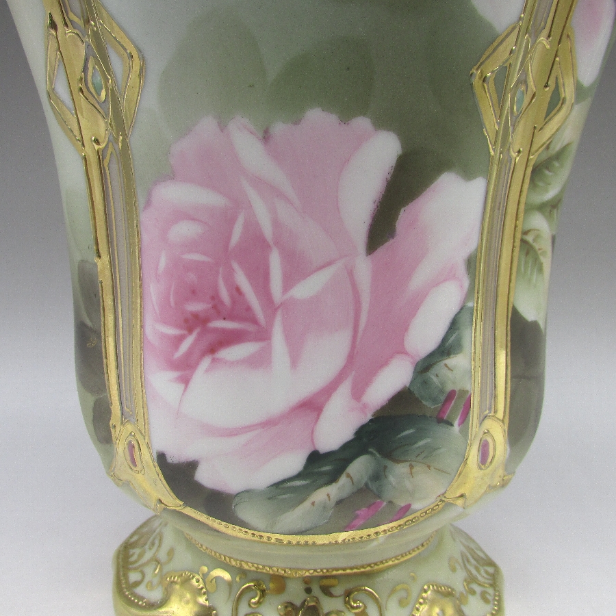 オールドノリタケの金彩薔薇文把手付花瓶です。1911年頃~1921年頃にアメリカに輸出され、約100年の時を経て日本に里帰りしてきました。アール・ヌーヴォ時代の影響を受けた薔薇を描き、周囲を金彩で豪華に仕上げた素晴らしい作品です。輸出陶磁器におけるデザインでは、花が最も多く、中でも薔薇が一番人気でした。薔薇は中世以来に日本の美術工芸で好まれたモティーフであった為に、絵付け職人にも馴染みがあり描きやすかったと思います。アール・ヌーヴォ(Art