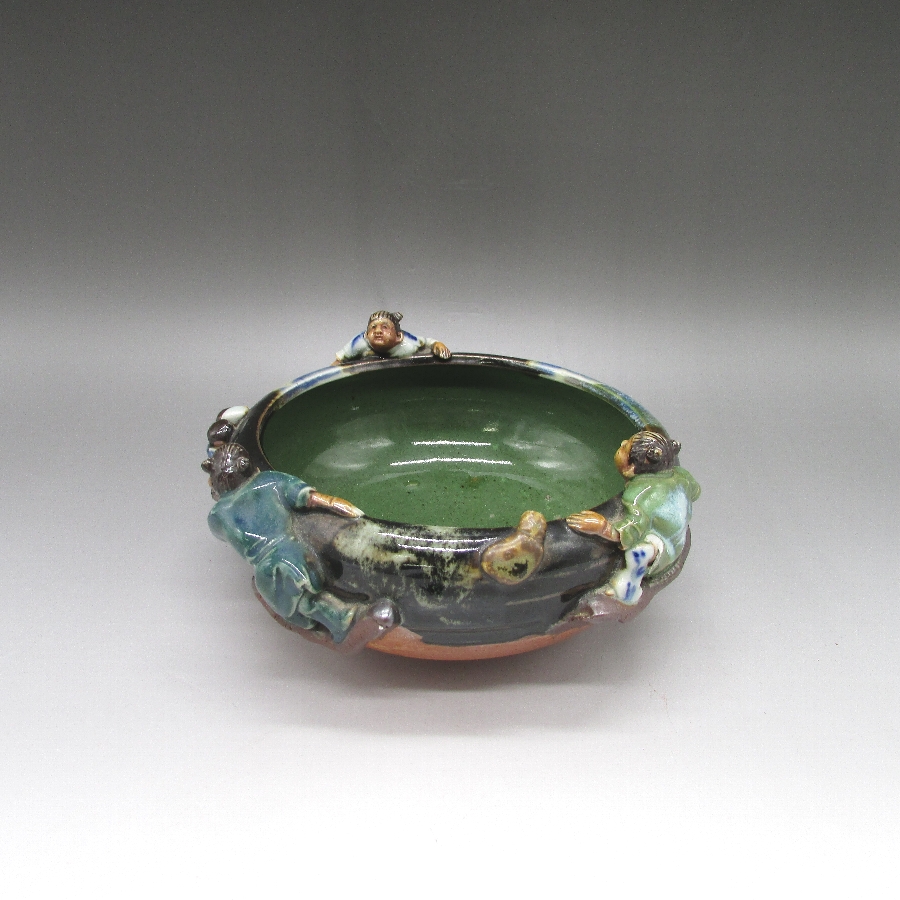 隅田焼の創始者「井上良斎」が主に欧米諸国向けに作陶した高浮彫人物図生花用鉢です。隅田焼は愛知県瀬戸市に生まれた井上良斎が1875年に島田惣兵衛の協力で、隅田川近くの浅草橋場町に窯を築いた事から始まりました。陶磁器に生き物や植物等を貼り付ける高浮彫の技法で装飾され、上部に薬を掛け流した生命力溢れる作品は、今までの日本の陶磁器にはなかった自由奔放さが表現されており、江戸の文化を漂わせています。輸出工芸として横浜港から欧米諸国に輸出された隅田焼は、欧米人を魅了しました。特に米国商社のヴァンタイン商会が長年に渡って取り扱いました。