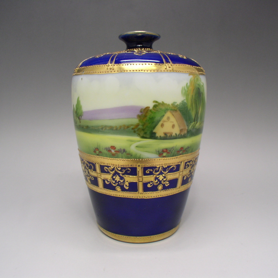 オールドノリタケの金彩コバルト風景文花瓶です。1911年頃~1921年頃にアメリカに輸出され、約100年の時を経て日本に里帰りしてきました。