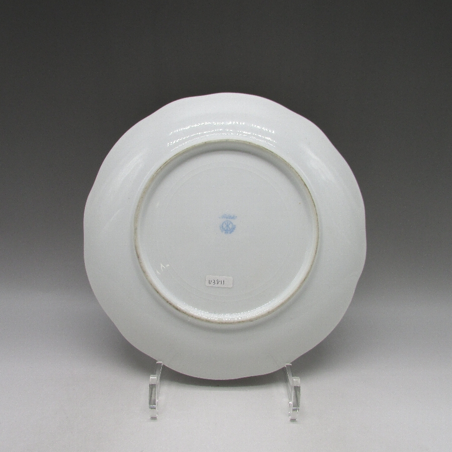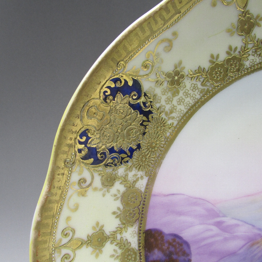 オールドノリタケの金盛夕焼湖畔白鳥風景文飾皿です。1906年頃~1925年頃にイギリスに輸出され、約100年の時を経て日本に里帰りしてきました。山水湖畔に佇む白鳥を描き、周囲を金盛り装飾で豪華絢爛に仕上げた豪華絢爛な作品です。金盛り装飾は高級品の代表的な装飾技法で、点や線などを泥漿で描き、焼成した後に金液を筆などで塗り被せて仕上げる技法です。オールドノリタケでよく用いられている金液は金の延棒を濃塩酸と濃硝酸を体積比で3対1に混ぜた溶液で溶解し液状にしたものを使用していました。