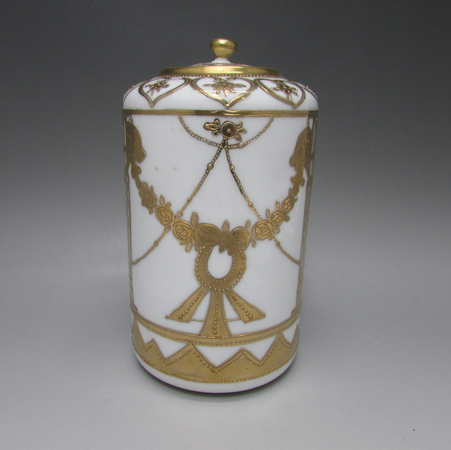 オールドノリタケの金彩草花文ティーリーフジャーです。1891年頃~1915年頃にアメリカに輸出され、約100年の時を経て日本に里帰りしてきました。オールドノリタケは現在のノリタケカンパニーが明治末期から戦前までに製造したアンティーク陶磁器の総称です。豪華絢爛な西洋風絵付け陶磁器は海外で人気を博しました。近年では、約100年という長い歳月を経て日本に里帰りしてきたことで、わが国でも大変人気が高くなっており、美術工芸品として高い地位を確保しつつあります。