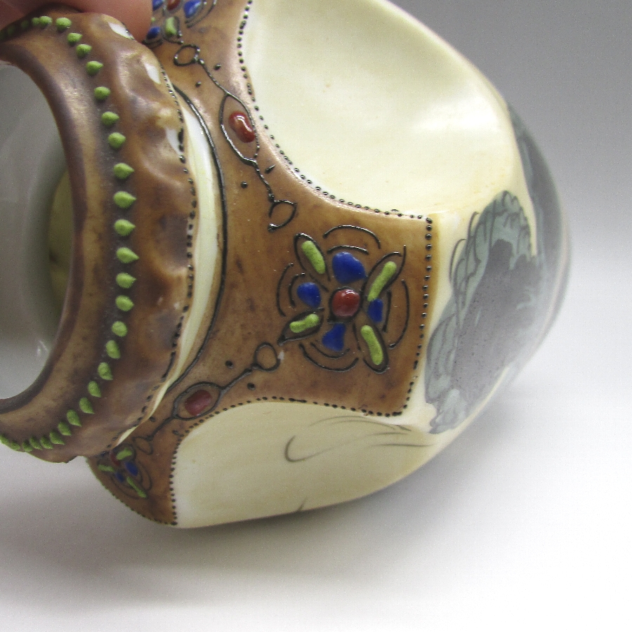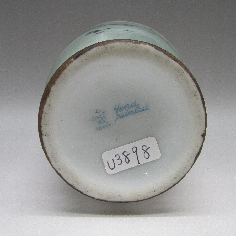 オールドノリタケの夕焼コテージ風景文花瓶です。1891年頃~1915年頃にアメリカに輸出され、約100年の時を経て日本に里帰りしてきました。風景画デザインは輸出陶磁器においては明治末期頃から使用され、アール・ヌーヴォ時代の影響を受けた田舎にある小屋を描いた牧歌的な雰囲気が素敵な作品です。アール・ヌーヴォ(Art