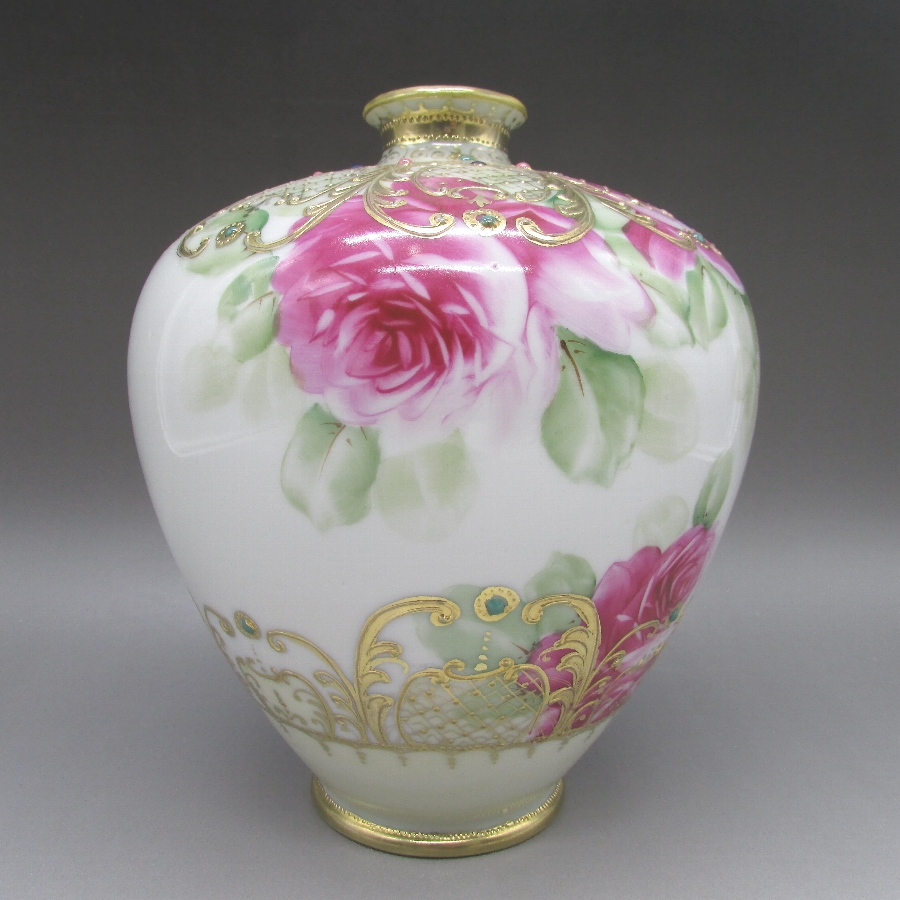 オールドノリタケの金盛ジュール薔薇文花瓶です。1891年頃~1915年頃にアメリカに輸出され、約100年の時を経て日本に里帰りしてきました。オールドノリタケは現在のノリタケカンパニーが明治末期から戦前までに製造したアンティーク陶磁器の総称です。豪華絢爛な西洋風絵付け陶磁器は海外で人気を博しました。近年では、約100年という長い歳月を経て日本に里帰りしてきたことで、わが国でも大変人気が高くなっており、美術工芸品として高い地位を確保しつつあります。