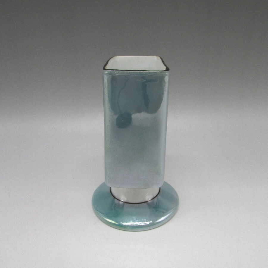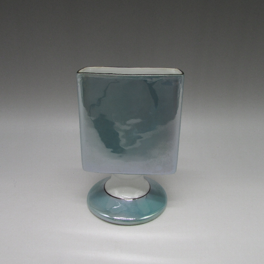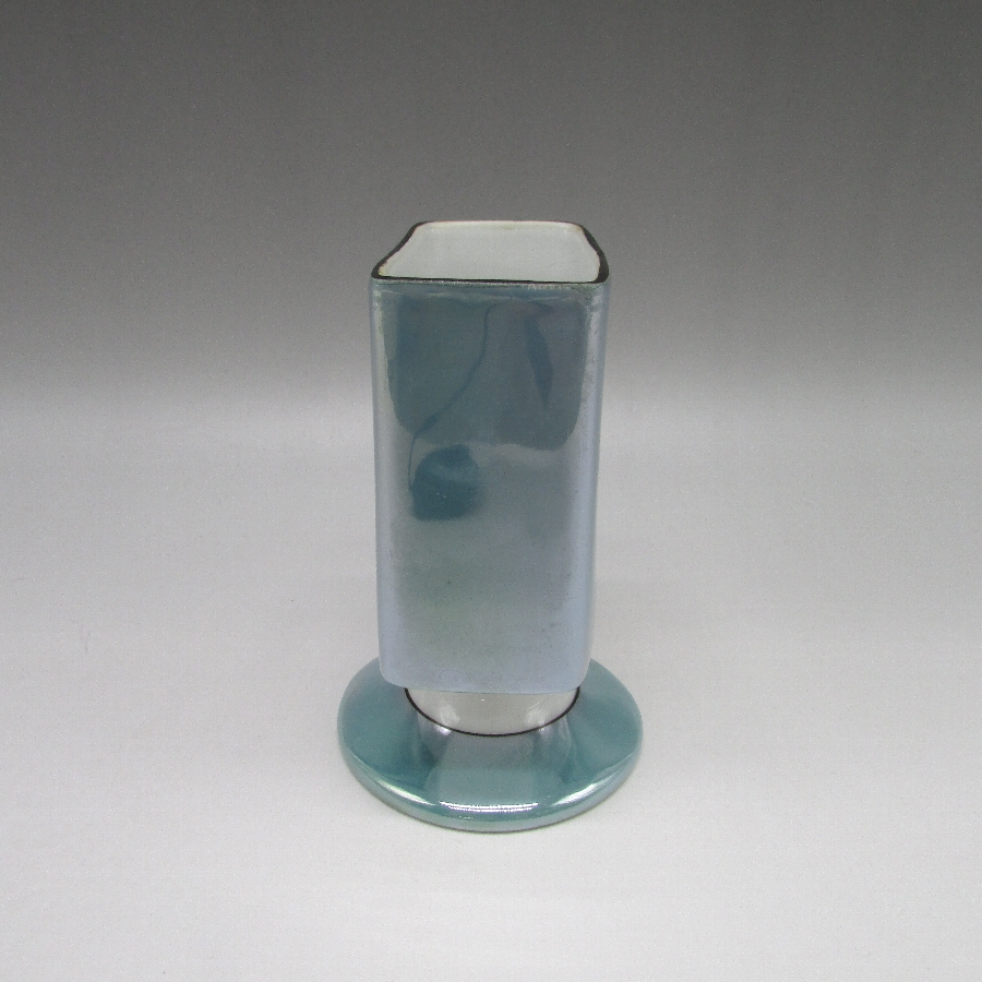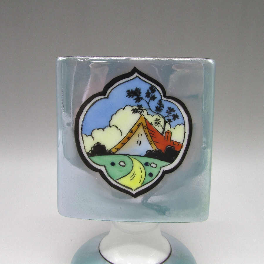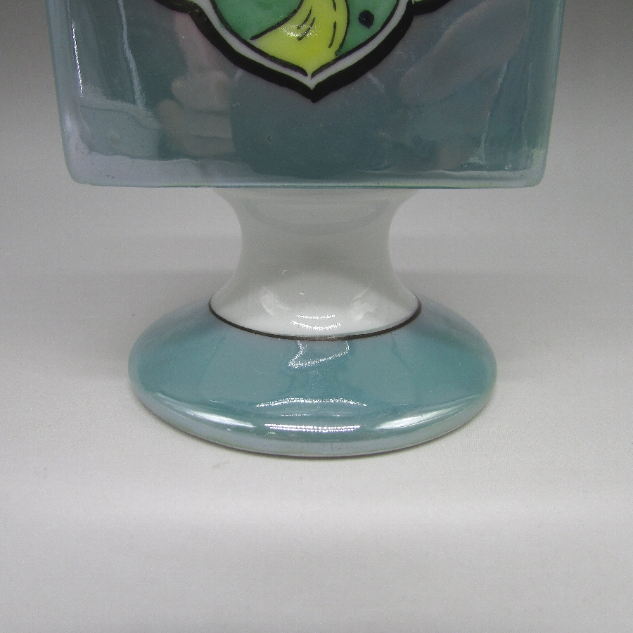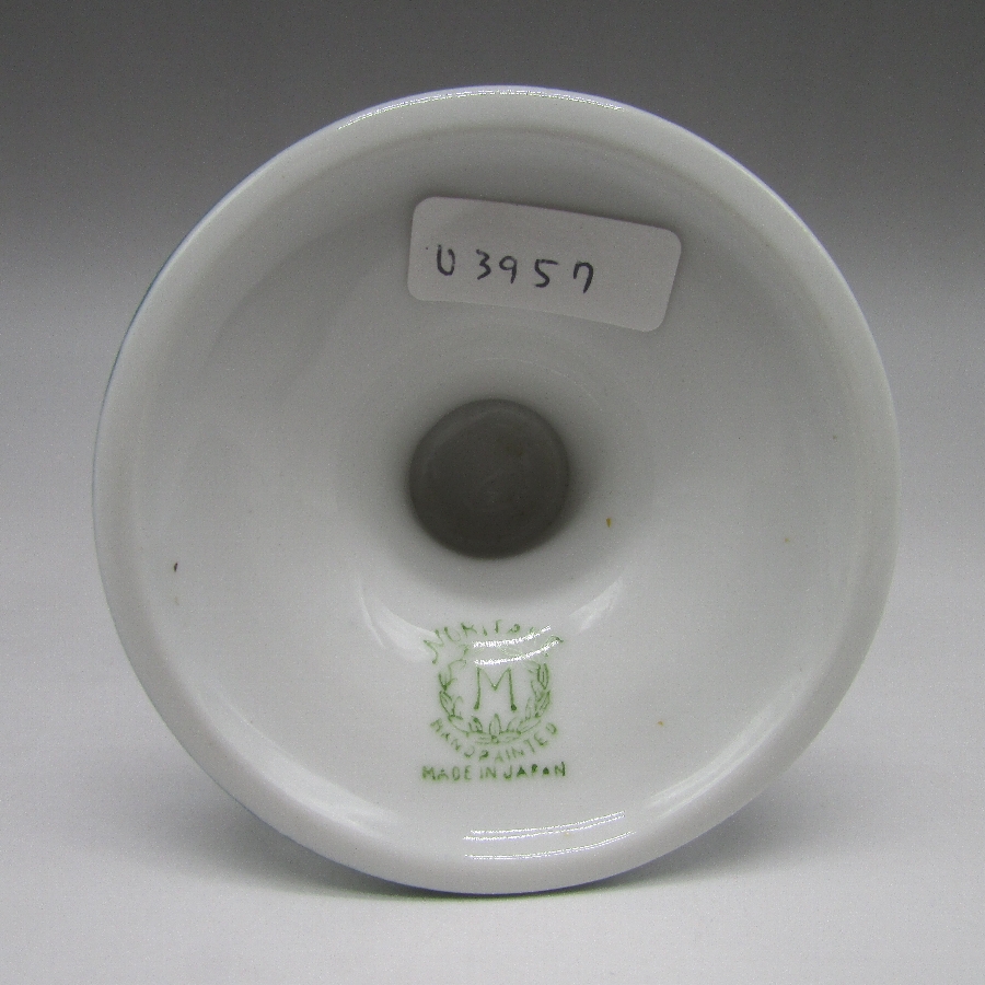 オールドノリタケのアールデコ丘上風景文シガレットホルダーです。1921年頃~1941年頃にアメリカに輸出され、約100年の時を経て日本に里帰りしてきました。窓絵に小屋を描き、周囲をラスター彩で煌びやかに仕上げたいアールデコ期の作品です。アールデコは1925年にフランスのパリで開催された現代装飾産業美術国際博覧会によって呼ばれるようになった装飾様式です。東洋美術などの芸術的要素を取り入れた直線と立体のシンプルかつ合理的な機能美あるデザインで、明るく・鮮やかな色彩が特徴的です。ノリタケのアール・デコのデザインは1919年に英国人デザイナーの「シリル・シー」が入社してから本格的に始まりました。ノリタケ・アール・デコの制作は1920年頃から1929年の世界恐慌までのわずか10年間程度の制作期間しかなく、未だにその全貌は明らかにされていません。