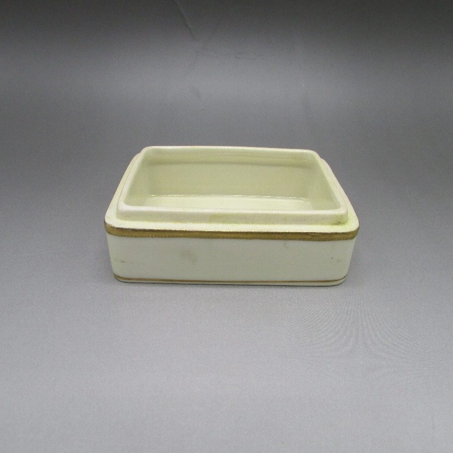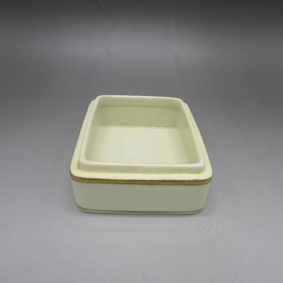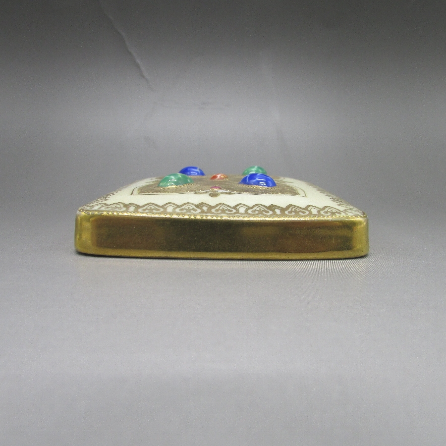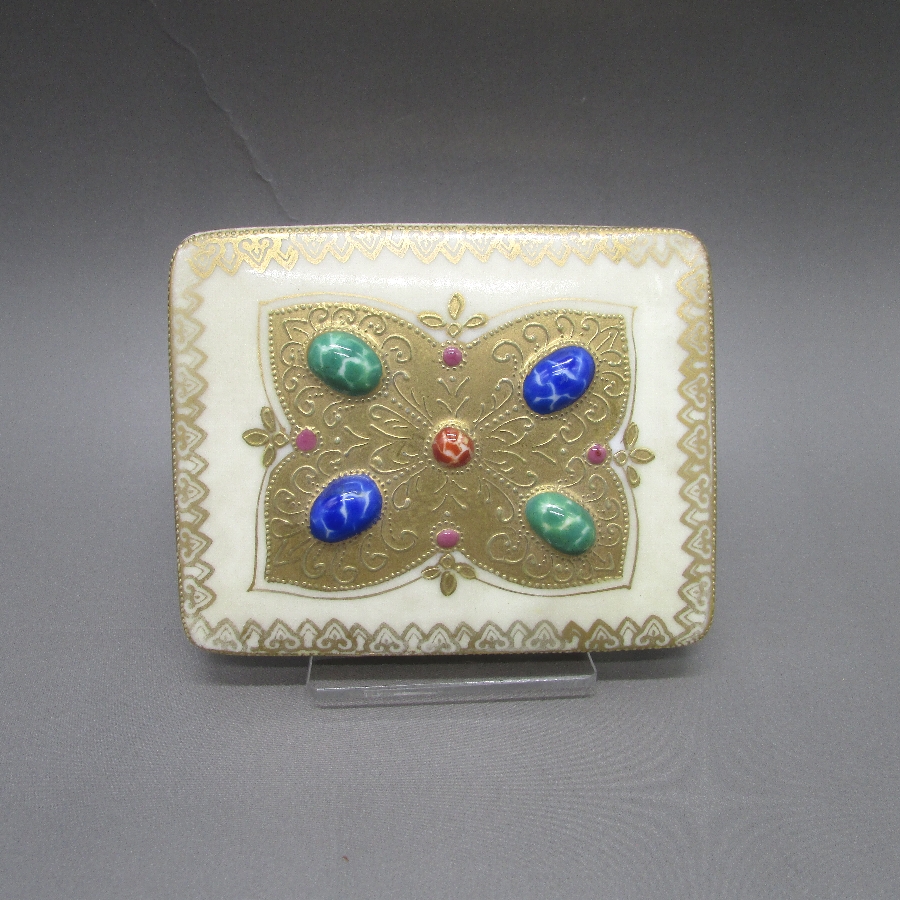 オールドノリタケのジュール草花文ジュエリーボックスです。1921年頃~1941年頃にアメリカに輸出され、約100年の時を経て日本に里帰りしてきました。ジュール盛りと金彩で豪華に仕上げたアールデコ期の作品です。当時はシガレットホルダー(煙草入れ)に使用していたものです。アールデコは1925年にフランスのパリで開催された現代装飾産業美術国際博覧会によって呼ばれるようになった装飾様式です。東洋美術などの芸術的要素を取り入れた直線と立体のシンプルかつ合理的な機能美あるデザインで、明るく・鮮やかな色彩が特徴的です。ノリタケのアール・デコのデザインは1919年に英国人デザイナーの「シリル・シー」が入社してから本格的に始まりました。ノリタケ・アール・デコの制作は1920年頃から1929年の世界恐慌までのわずか10年間程度の制作期間しかなく、未だにその全貌は明らかにされていません。