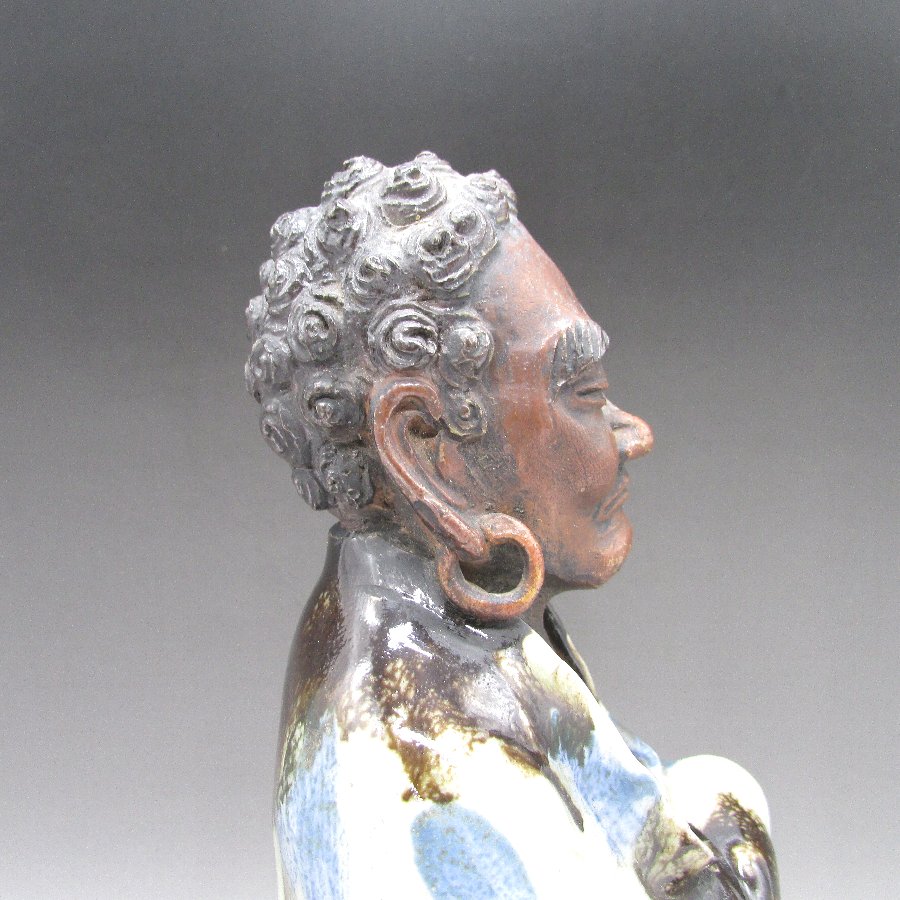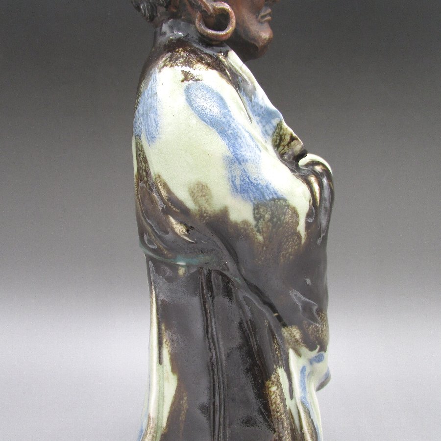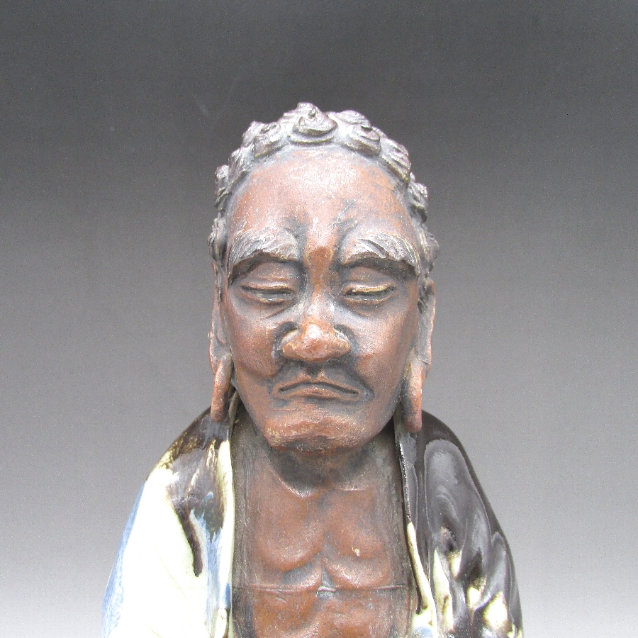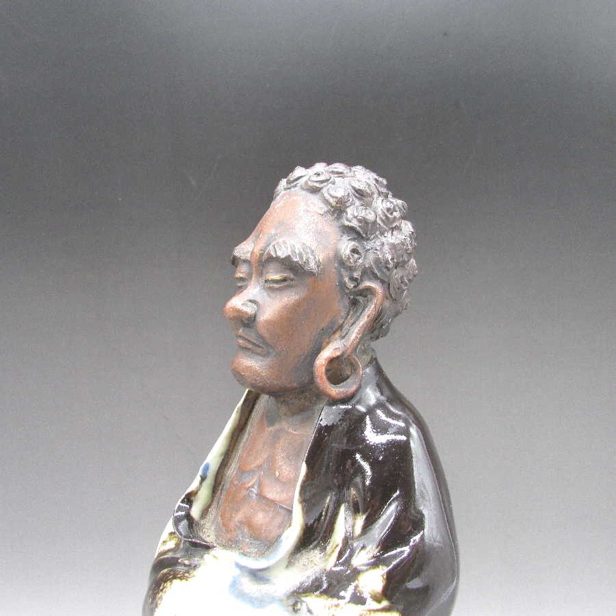 隅田焼・香二が主に欧米諸国向けに作陶した僧侶の置物です。本名は石田郷三。隅田焼の陶工として伝えられているが、生没年や経歴、活動期間などについての詳細は現在のところわかっていません。隅田焼の創始者・井上良斎の作品と類似している事から、良斎窯で働いていて独立したと考えられます。その独特な作風は欧米人の愛好家に好評で、人気を博しました。特にセントルイス万博に出品した「五百羅漢」はマサチューセッツ州のスミス美術館に収蔵されています。1899年の第9回東京府外九県連合共進会では受賞、1901年の全国窯業品共進会、1904年のセントルイス万国博覧会に出品しています。