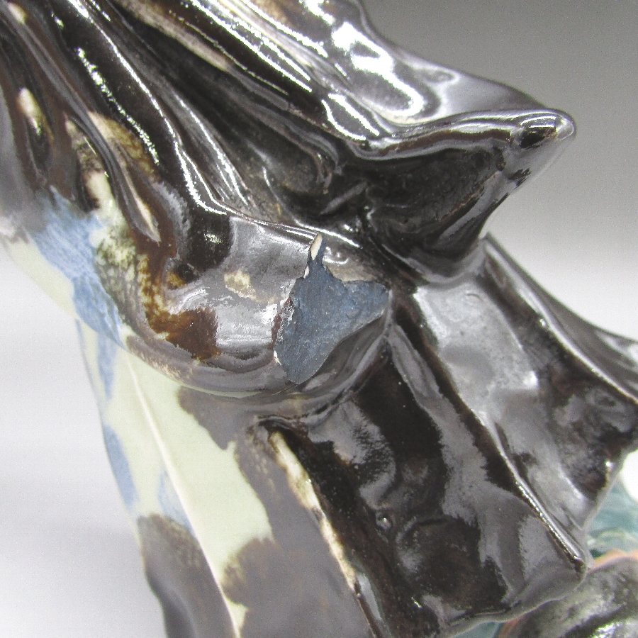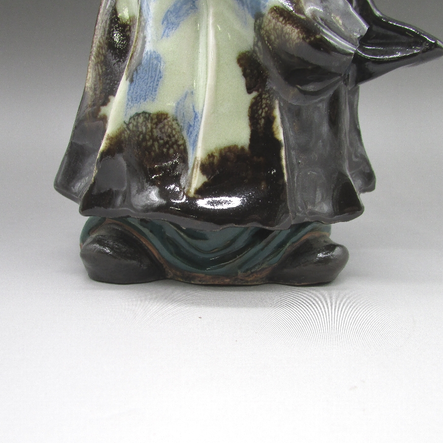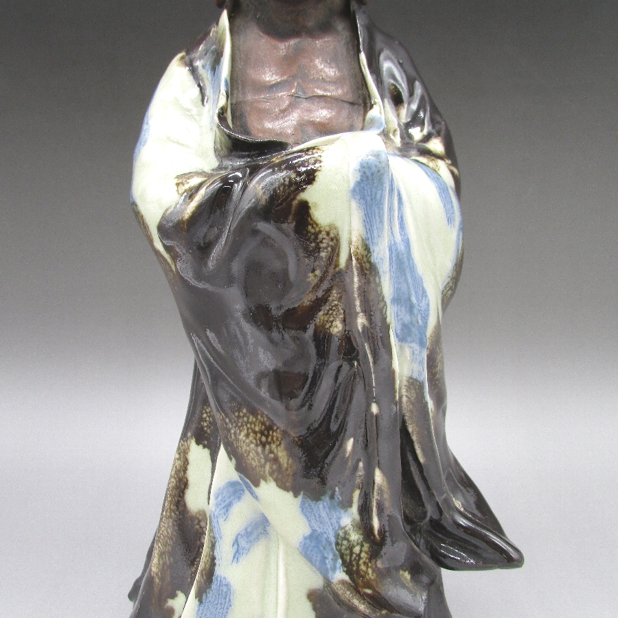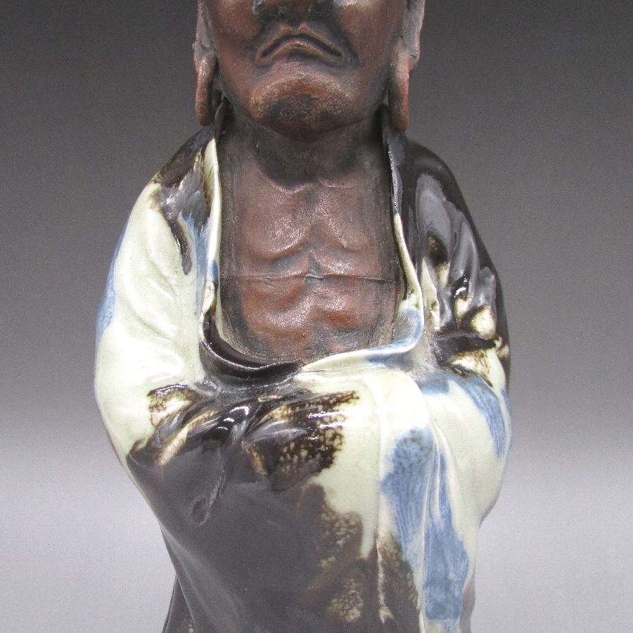 隅田焼・香二が主に欧米諸国向けに作陶した僧侶の置物です。本名は石田郷三。隅田焼の陶工として伝えられているが、生没年や経歴、活動期間などについての詳細は現在のところわかっていません。隅田焼の創始者・井上良斎の作品と類似している事から、良斎窯で働いていて独立したと考えられます。その独特な作風は欧米人の愛好家に好評で、人気を博しました。特にセントルイス万博に出品した「五百羅漢」はマサチューセッツ州のスミス美術館に収蔵されています。1899年の第9回東京府外九県連合共進会では受賞、1901年の全国窯業品共進会、1904年のセントルイス万国博覧会に出品しています。