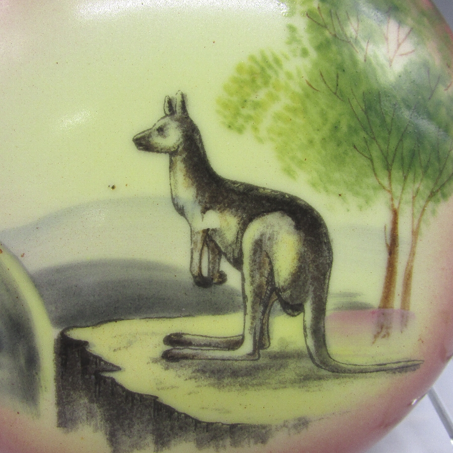 オールドノリタケのカンガルー風景文カバーボックスです。1906年頃~1925年頃にイギリスに輸出され、約100年の時を経て日本に里帰りしてきました。オールドノリタケでは犬、獅子、鹿など多種多様な動物を描いたシリーズがありますが、カンガルーは大変に珍しいデザインで、優しい雰囲気が人々を魅了しています。