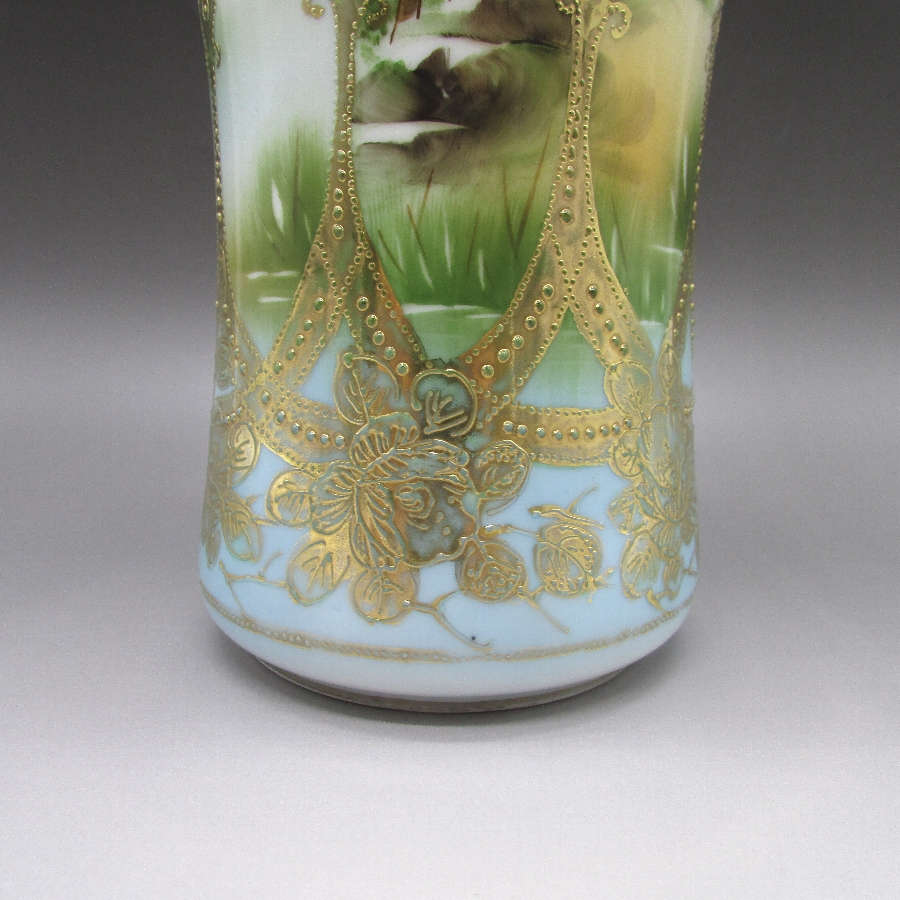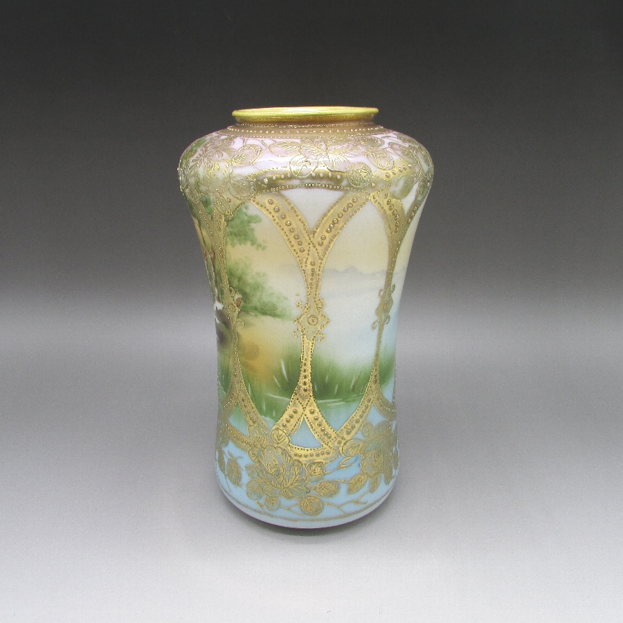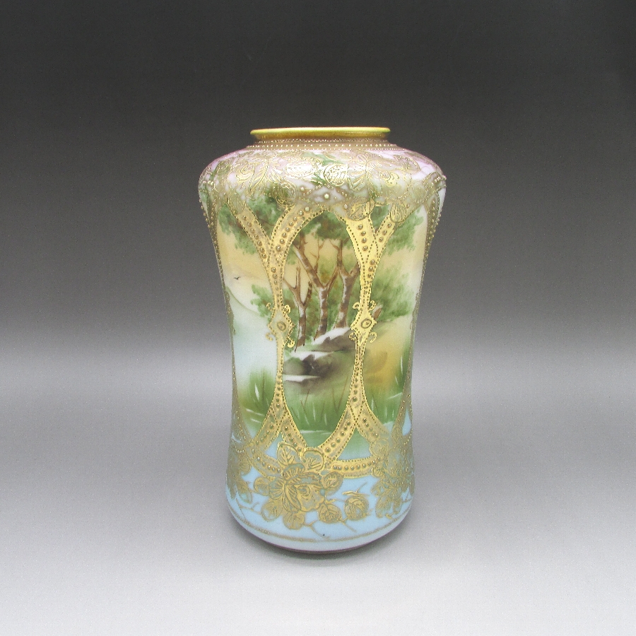 オールドノリタケの金盛湖畔風景文花瓶です。1891年頃~1915年頃にアメリカに輸出され、約100年の時を経て日本に里帰りしてきました。「The Collector’s