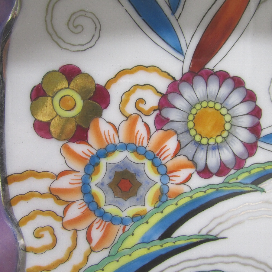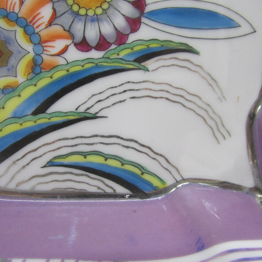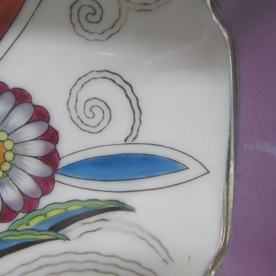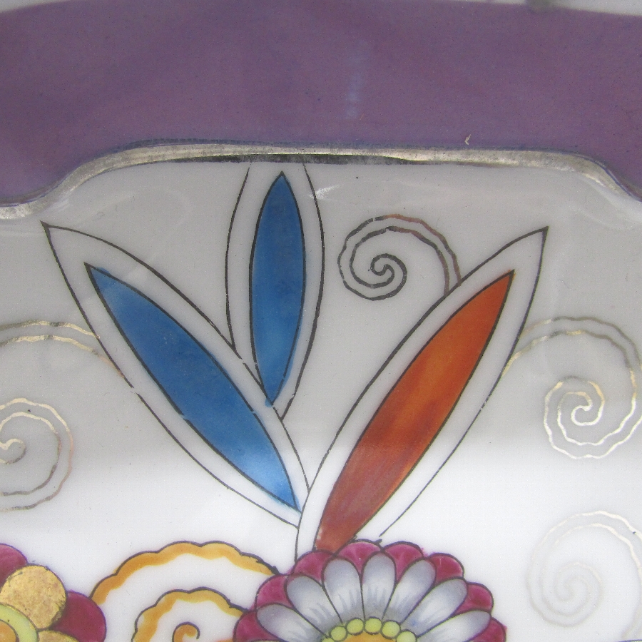 オールドノリタケのアールデコ銀彩花文ボウルです。1911年頃~1941年頃にイギリスに輸出され、約100年の時を経て日本に里帰りしてきました。オールドノリタケは現在のノリタケカンパニーが明治末期から戦前までに製造したアンティーク陶磁器の総称です。豪華絢爛な西洋風絵付け陶磁器は海外で人気を博しました。近年では、約100年という長い歳月を経て日本に里帰りしてきたことで、わが国でも大変人気が高くなっており、美術工芸品として高い地位を確保しつつあります。