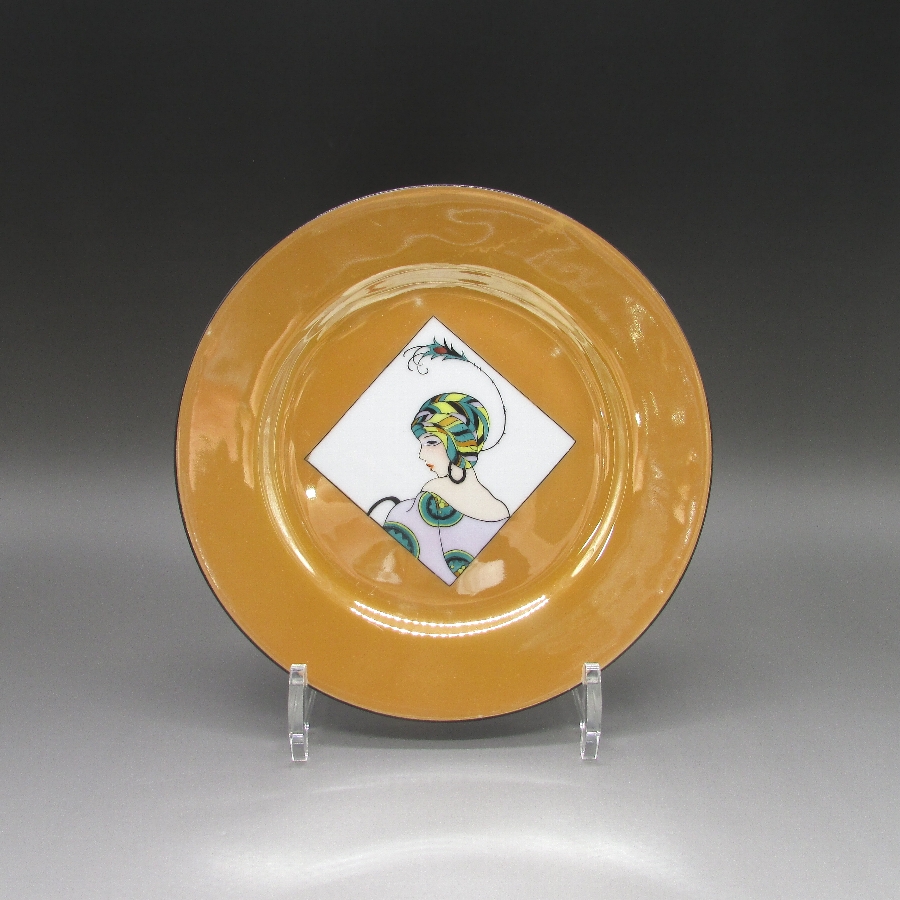 オールドノリタケのアールデコ期の孔雀柄ターバンレディプレートです。1921年頃~1941年頃にアメリカに輸出され、約100年の時を経て日本に里帰りしてきました。アールデコ時代に流行した貴婦人をモティーフにした作品です。「愛らしく、明るい雰囲気」が特徴的です。アールデコとは1925年にフランスのパリで開催された現代装飾産業美術国際博覧会によって呼ばれるようになった装飾様式です。東洋美術などの芸術的要素を取り入れた直線と立体のシンプルかつ合理的な機能美あるデザインで、明るく・鮮やかな色彩が特徴的です。ノリタケのアール・デコのデザインは、1919年に英国人デザイナーの「シリル・シー」が入社してから本格的に始まりました。ノリタケ・アール・デコの制作は、1920年頃から1929年の世界恐慌までのわずか10年間程度の制作期間しかなく、未だにその全貌は明らかにされていません。