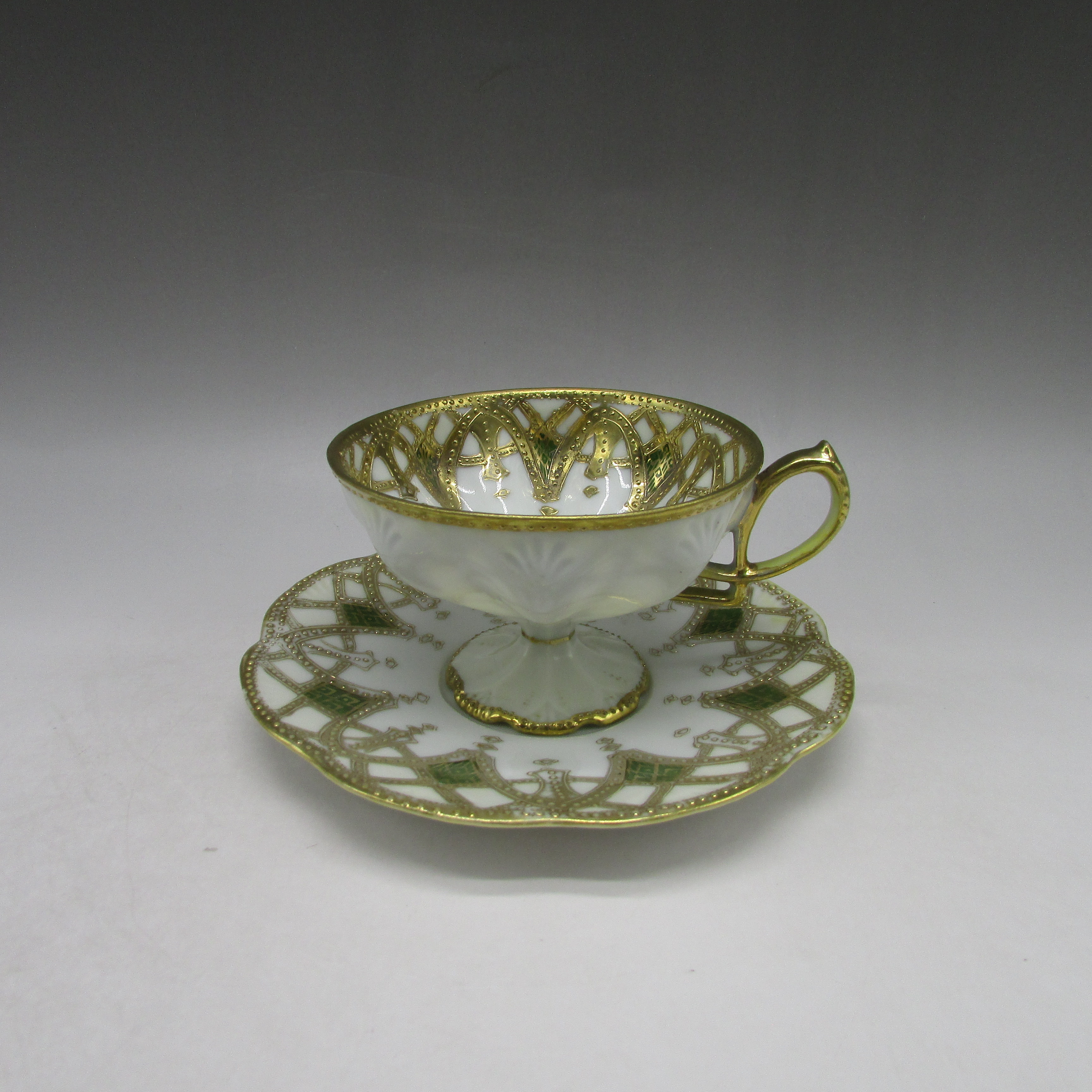 オールドノリタケの金盛草花文カップ&ソーサーです。1891年頃~1915年頃にアメリカに輸出され、約100年の時を経て日本に里帰りしてきました。オールドノリタケは現在のノリタケカンパニーが明治末期から戦前までに製造したアンティーク陶磁器の総称です。豪華絢爛な西洋風絵付け陶磁器は海外で人気を博しました。近年では、約100年という長い歳月を経て日本に里帰りしてきたことで、わが国でも大変人気が高くなっており、美術工芸品として高い地位を確保しつつあります。