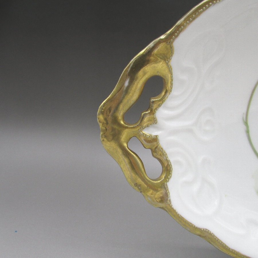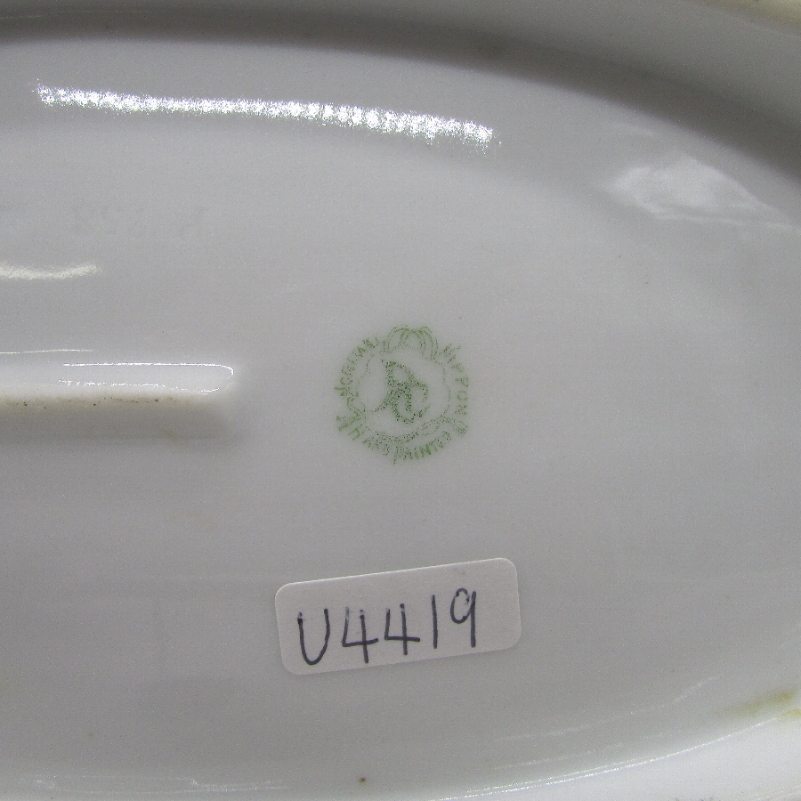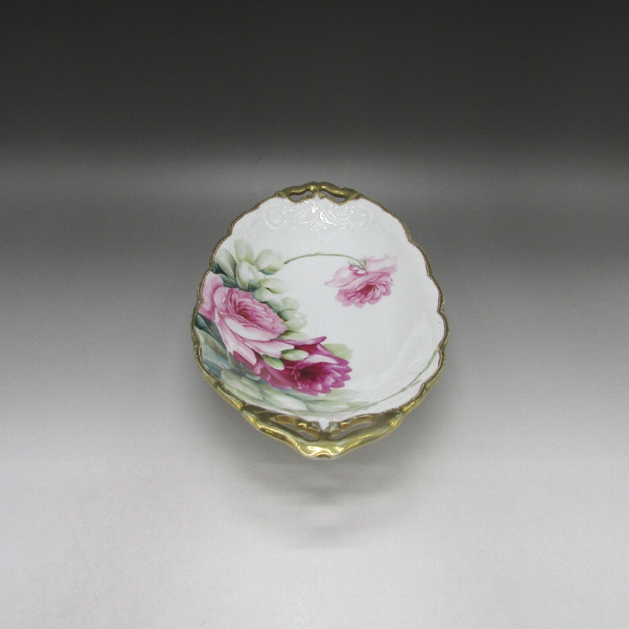 オールドノリタケの花押サイン入り薔薇文皿です。1906年頃~1921年頃にアメリカに輸出され、約100年の時を経て日本に里帰りしてきました。オールドノリタケは現在のノリタケカンパニーが明治末期から戦前までに製造したアンティーク陶磁器の総称です。豪華絢爛な西洋風絵付け陶磁器は海外で人気を博しました。近年では、約100年という長い歳月を経て日本に里帰りしてきたことで、わが国でも大変人気が高くなっており、美術工芸品として高い地位を確保しつつあります。