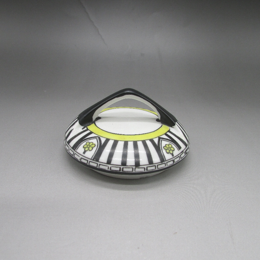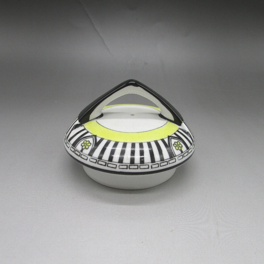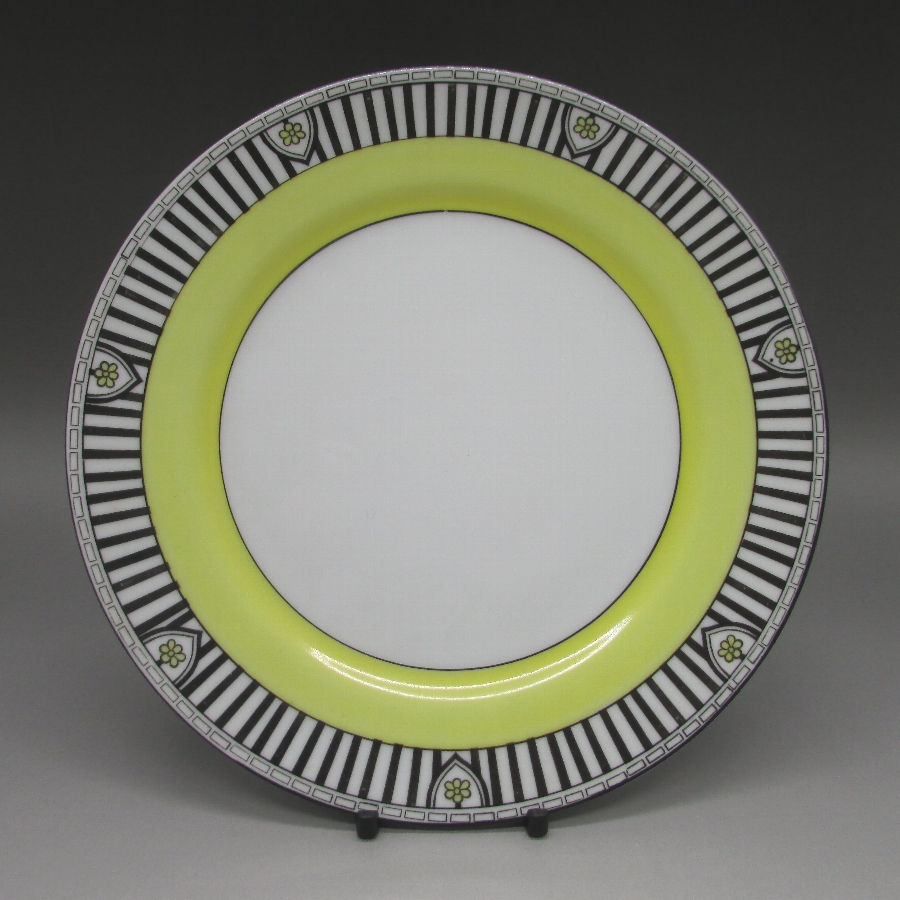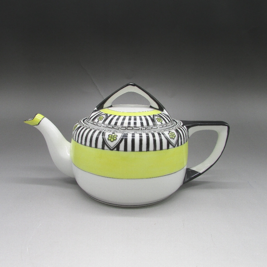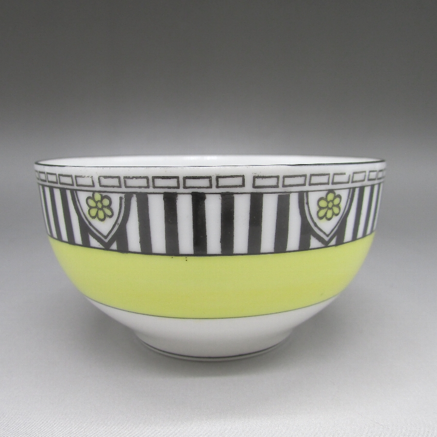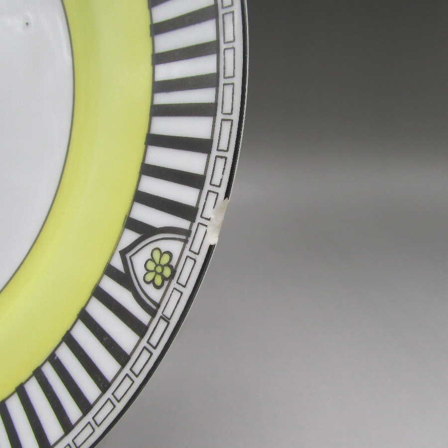 オールドノリタケのアールデコストライプ文ティーセットです。1921年頃~1941年頃にアメリカに輸出され、約100年の時を経て日本に里帰りしてきました。アールデコとは1925年にフランスのパリで開催された現代装飾産業美術国際博覧会によって呼ばれるようになった装飾様式です。東洋美術などの芸術的要素を取り入れた直線と立体のシンプルかつ合理的な機能美あるデザインで、明るく・鮮やかな色彩が特徴的です。ノリタケのアール・デコのデザインは、1919年に英国人デザイナーの「シリル・シー」が入社してから本格的に始まりました。ノリタケ・アール・デコの制作は、1920年頃から1929年の世界恐慌までのわずか10年間程度の制作期間しかなく、未だにその全貌は明らかにされていません。