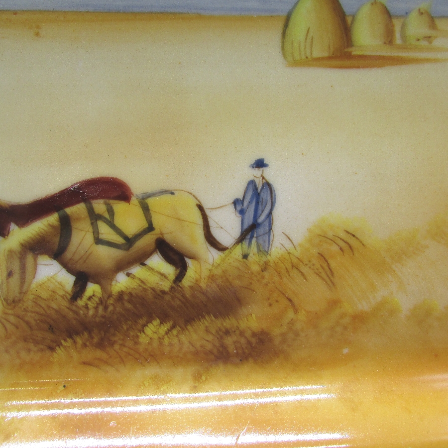 オールドノリタケの牧場風景文トレーです。1911年頃~1941年頃にイギリスに輸出され、約100年の時を経て日本に里帰りしてきました。風景画デザインは輸出陶磁器においては明治末期頃から使用され、欧米で人気を博しました。こちらの作品は暖色をベースに牧場を描いた牧歌的な雰囲気が優しい空間を演出しています。