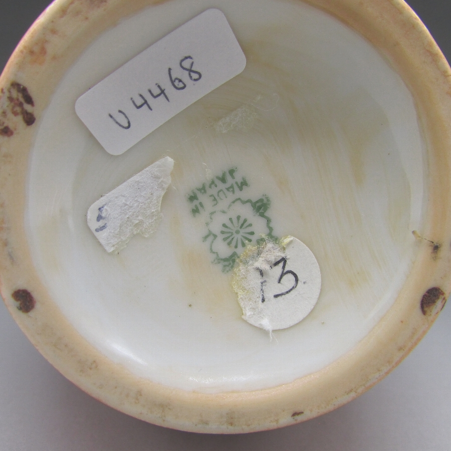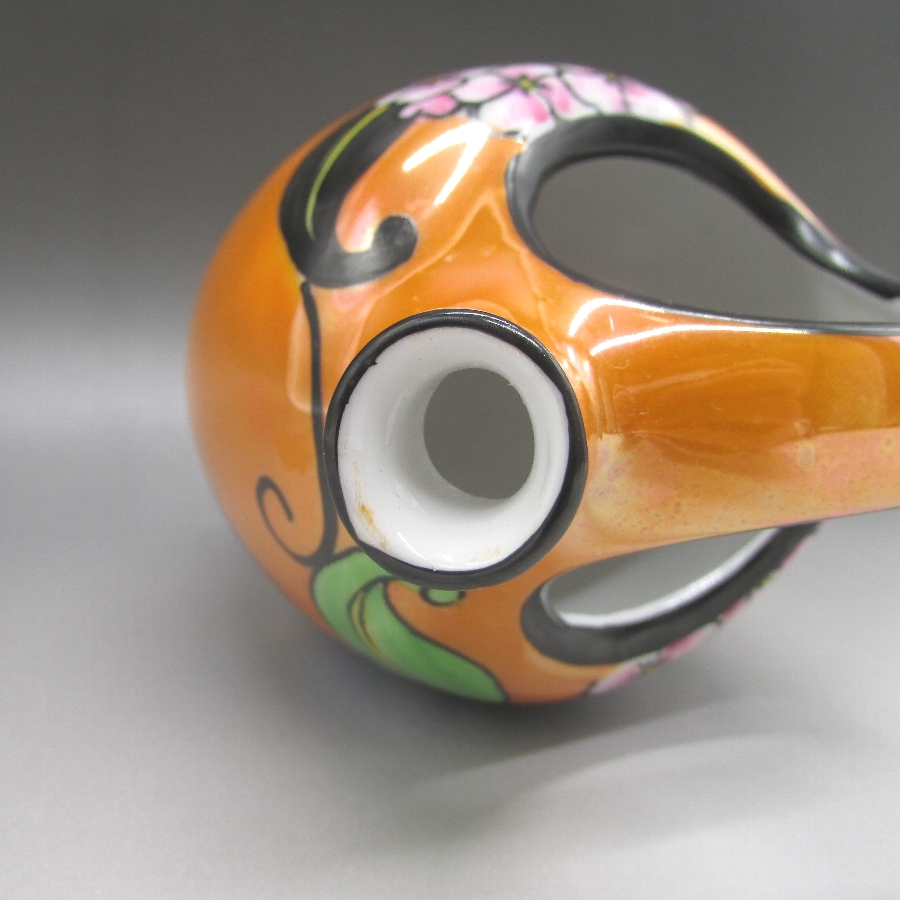 オールドノリタケのアールデコ紫陽花文水差です。1924年頃~1935年頃にアメリカに輸出され、約100年の時を経て日本に里帰りしてきました。オールドノリタケは現在のノリタケカンパニーが明治末期から戦前までに製造したアンティーク陶磁器の総称です。豪華絢爛な西洋風絵付け陶磁器は海外で人気を博しました。近年では、約100年という長い歳月を経て日本に里帰りしてきたことで、わが国でも大変人気が高くなっており、美術工芸品として高い地位を確保しつつあります。