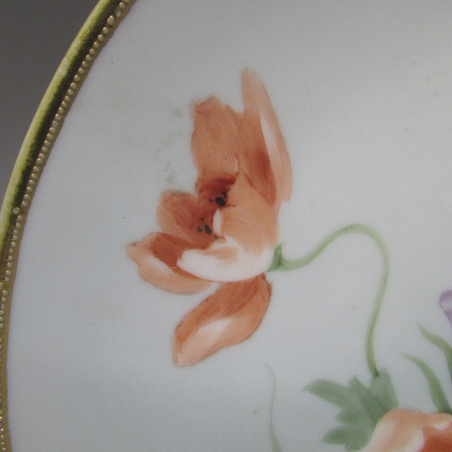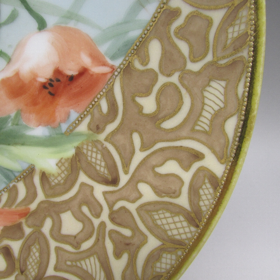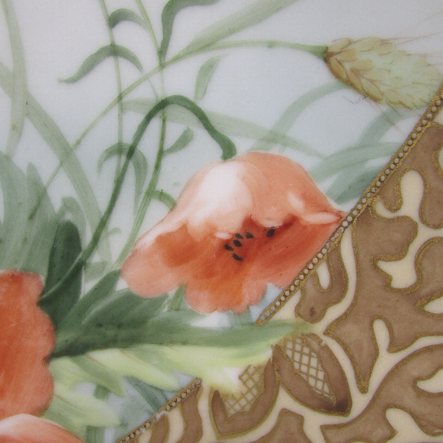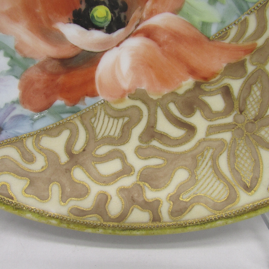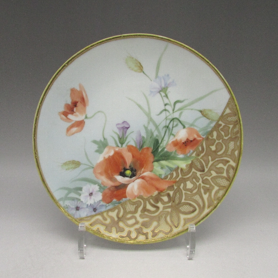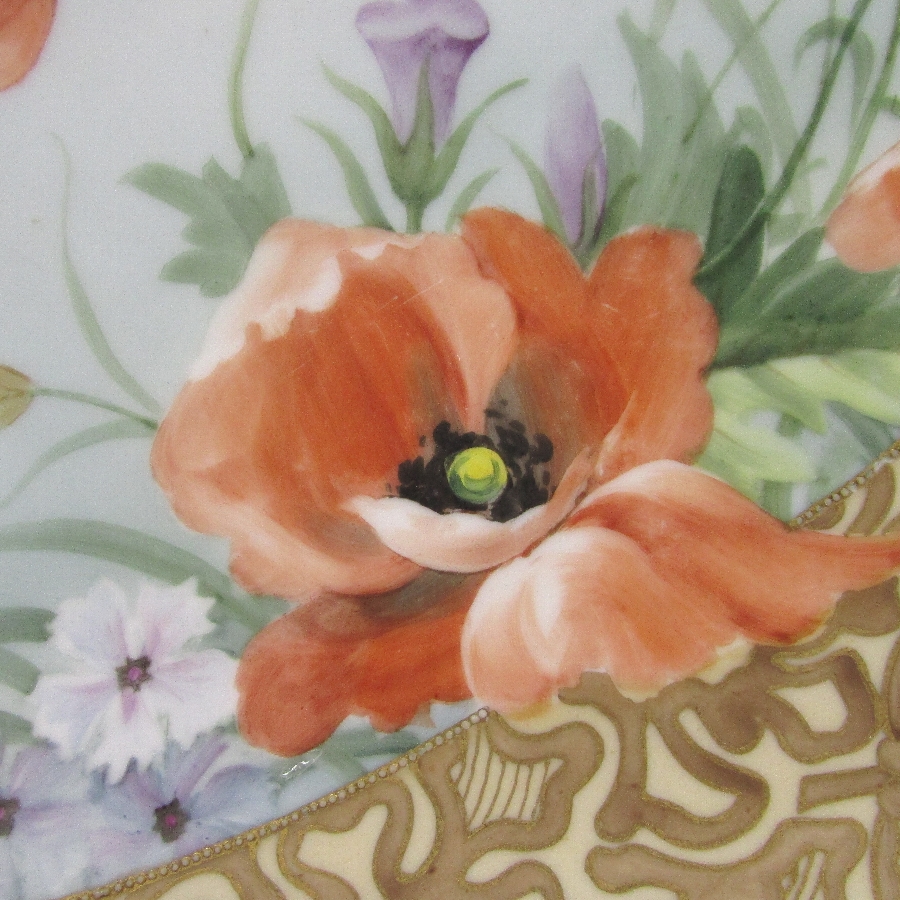 オールドノリタケの金彩芥子花文プレートです。1911年頃~1921年頃にアメリカに輸出され、約100年の時を経て日本に里帰りしてきました。芥子(ポピー)は春から初夏にかけて色鮮やかで美しい花を咲かせ、人気があります。赤色の芥子の花言葉は「感謝」、「喜び」です。アール・ヌーヴォ時代の影響を受けた素晴らしい作品です。アール・ヌーヴォ(Art