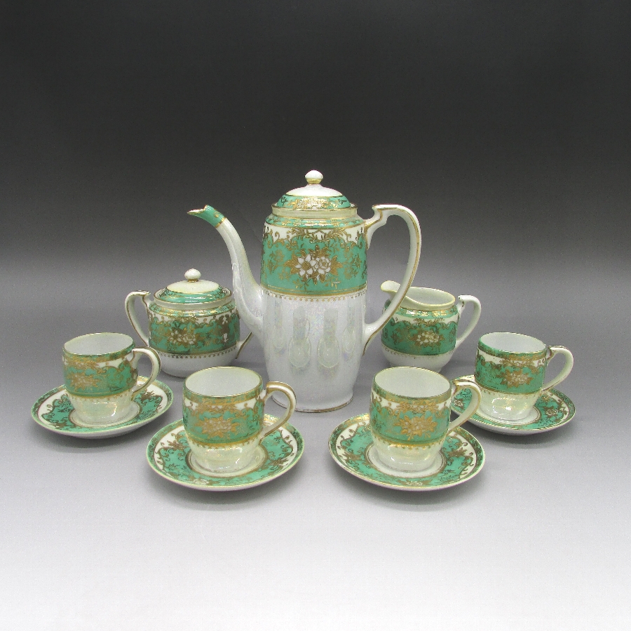 オールドノリタケの金彩エメラルド地草花文ティーセットです。1921年頃~1941年頃にアメリカに輸出され、約100年の時を経て日本に里帰りしてきました。オールドノリタケは現在のノリタケカンパニーが明治末期から戦前までに製造したアンティーク陶磁器の総称です。豪華絢爛な西洋風絵付け陶磁器は海外で人気を博しました。近年では、約100年という長い歳月を経て日本に里帰りしてきたことで、わが国でも大変人気が高くなっており、美術工芸品として高い地位を確保しつつあります。