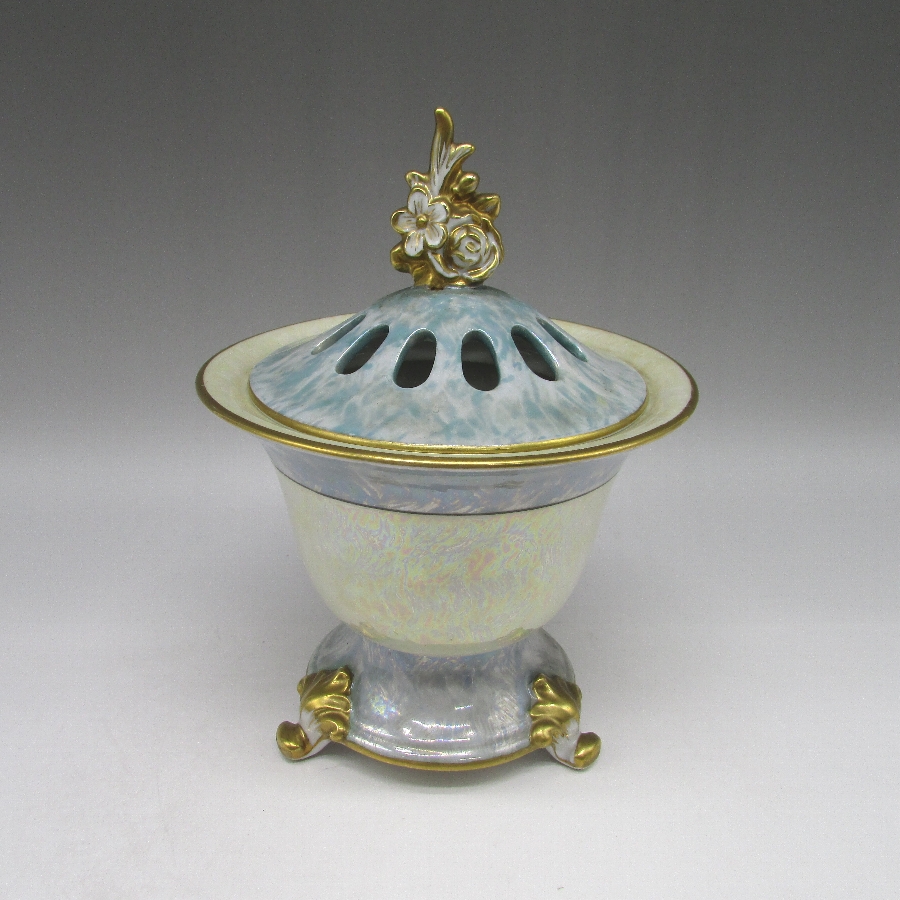 オールドノリタケの金彩花摘付ポプリポットです。1921年頃~1941年頃にアメリカに輸出され、約100年の時を経て日本に里帰りしてきました。オールドノリタケは現在のノリタケカンパニーが明治末期から戦前までに製造したアンティーク陶磁器の総称です。豪華絢爛な西洋風絵付け陶磁器は海外で人気を博しました。近年では、約100年という長い歳月を経て日本に里帰りしてきたことで、わが国でも大変人気が高くなっており、美術工芸品として高い地位を確保しつつあります。