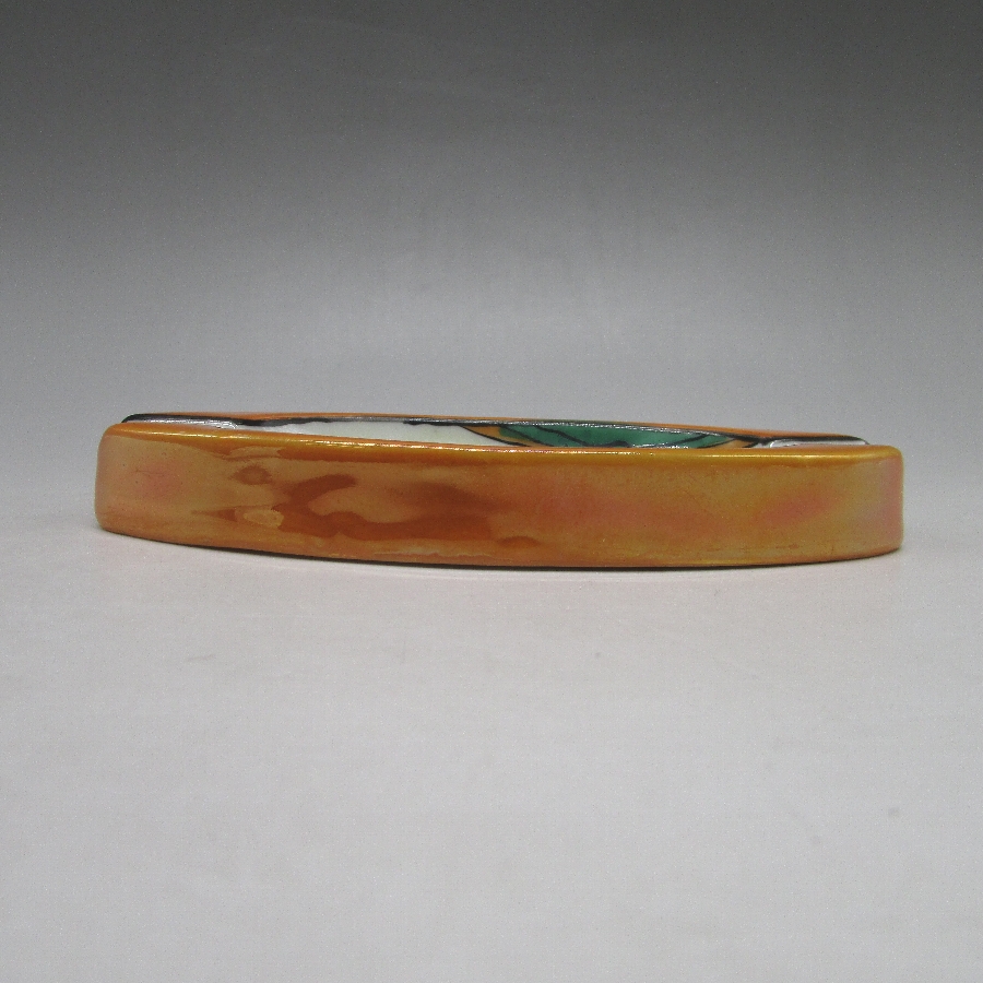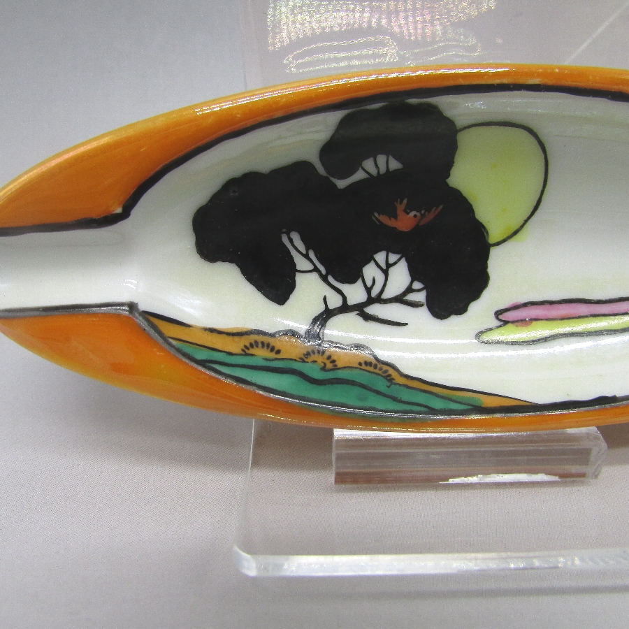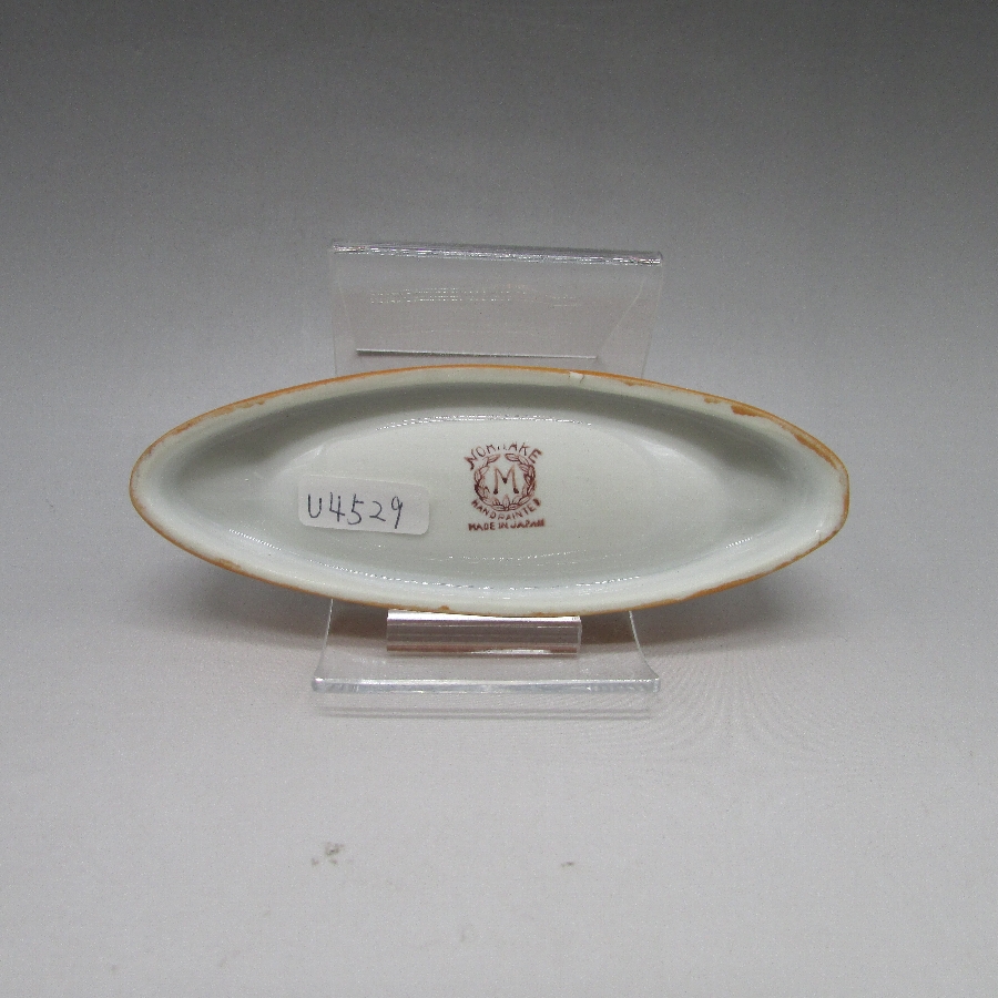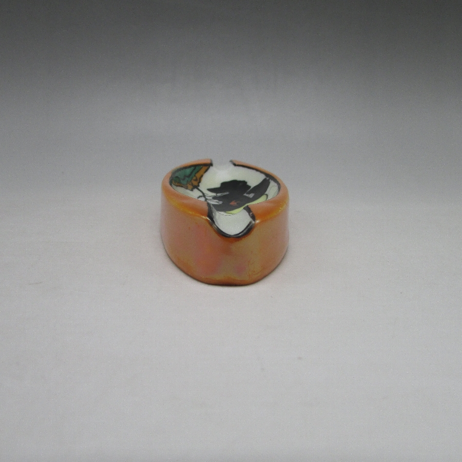 オールドノリタケのアールデコ風景文アッシュトレーです。1921年頃~1941年頃にアメリカに輸出され、約100年の時を経て日本に里帰りしてきました。チープな雰囲気が漂うレトロで可愛らしいアールデコ期の作品です。アールデコとは1925年にフランスのパリで開催された現代装飾産業美術国際博覧会によって呼ばれるようになった装飾様式です。東洋美術などの芸術的要素を取り入れた直線と立体のシンプルかつ合理的な機能美あるデザインで、明るく・鮮やかな色彩が特徴的です。ノリタケのアール・デコのデザインは、1919年に英国人デザイナーの「シリル・シー」が入社してから本格的に始まりました。ノリタケ・アール・デコの制作は、1920年頃から1929年の世界恐慌までのわずか10年間程度の制作期間しかなく、未だにその全貌は明らかにされていません。