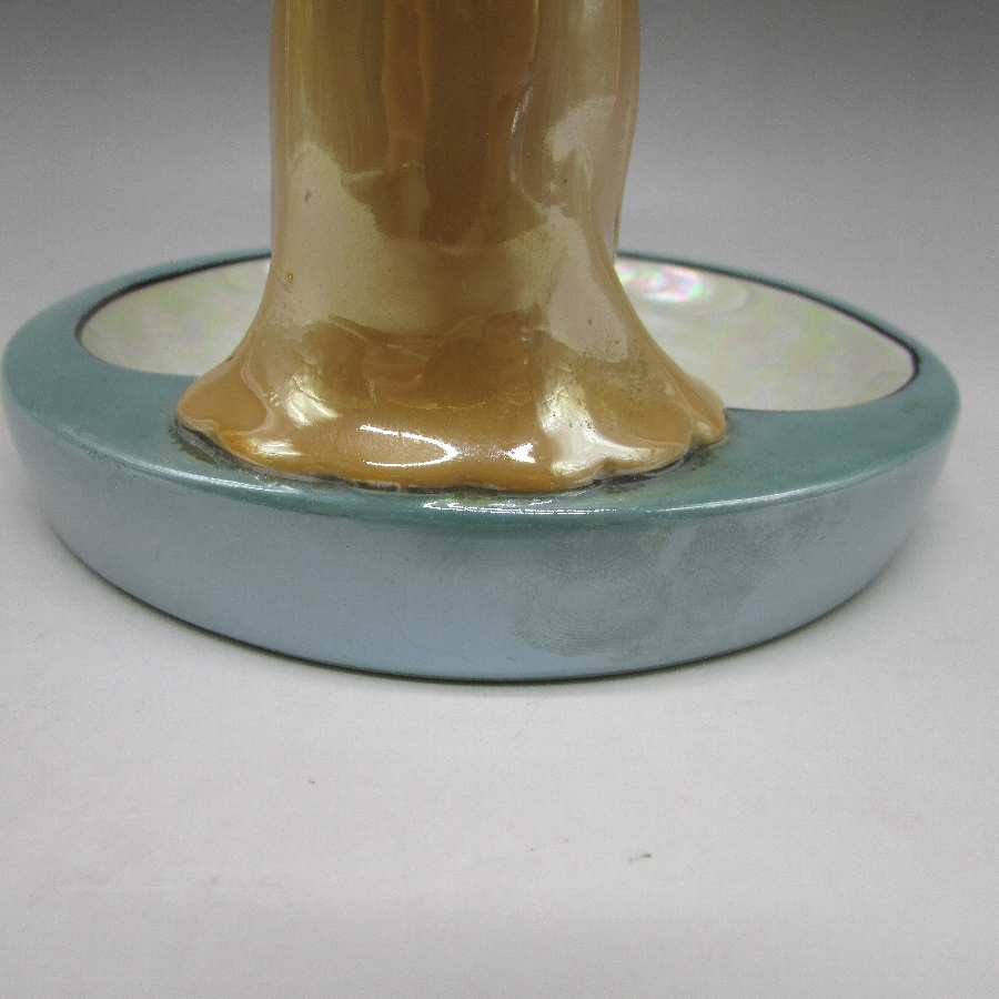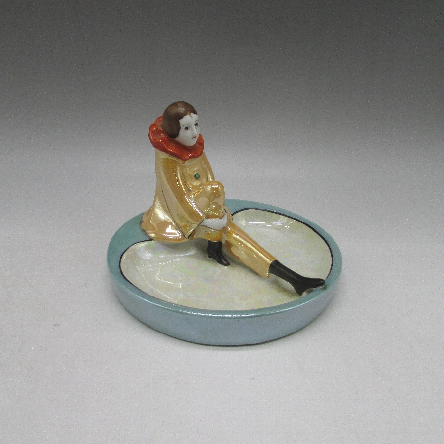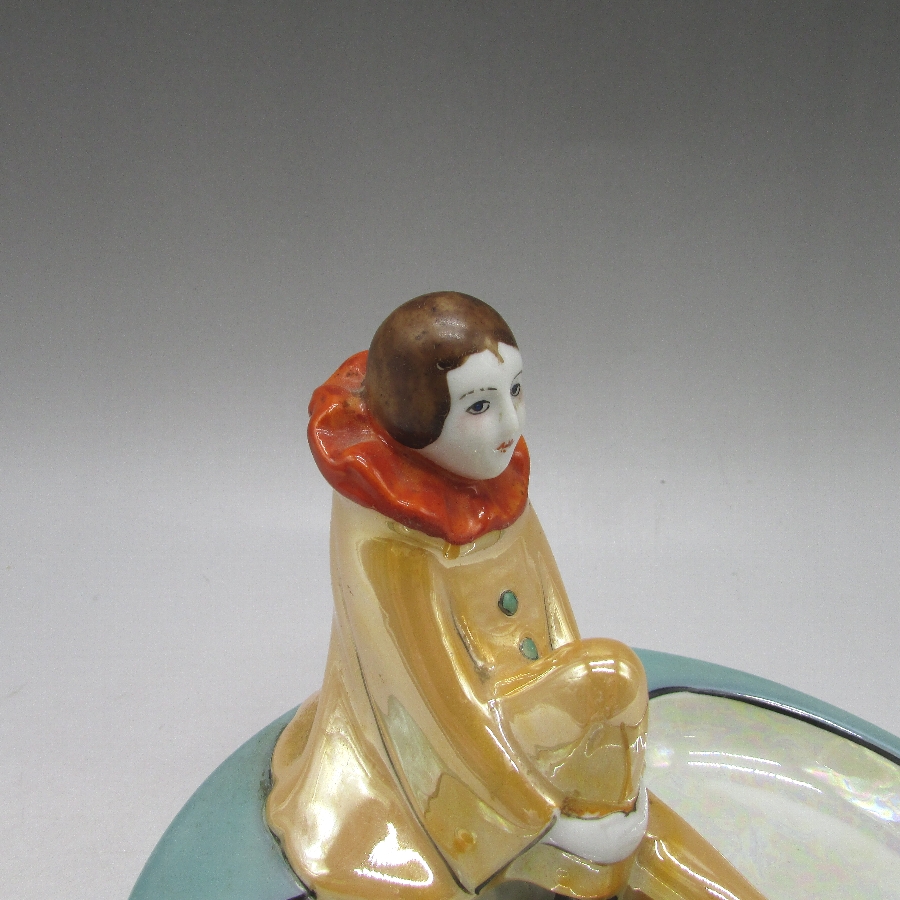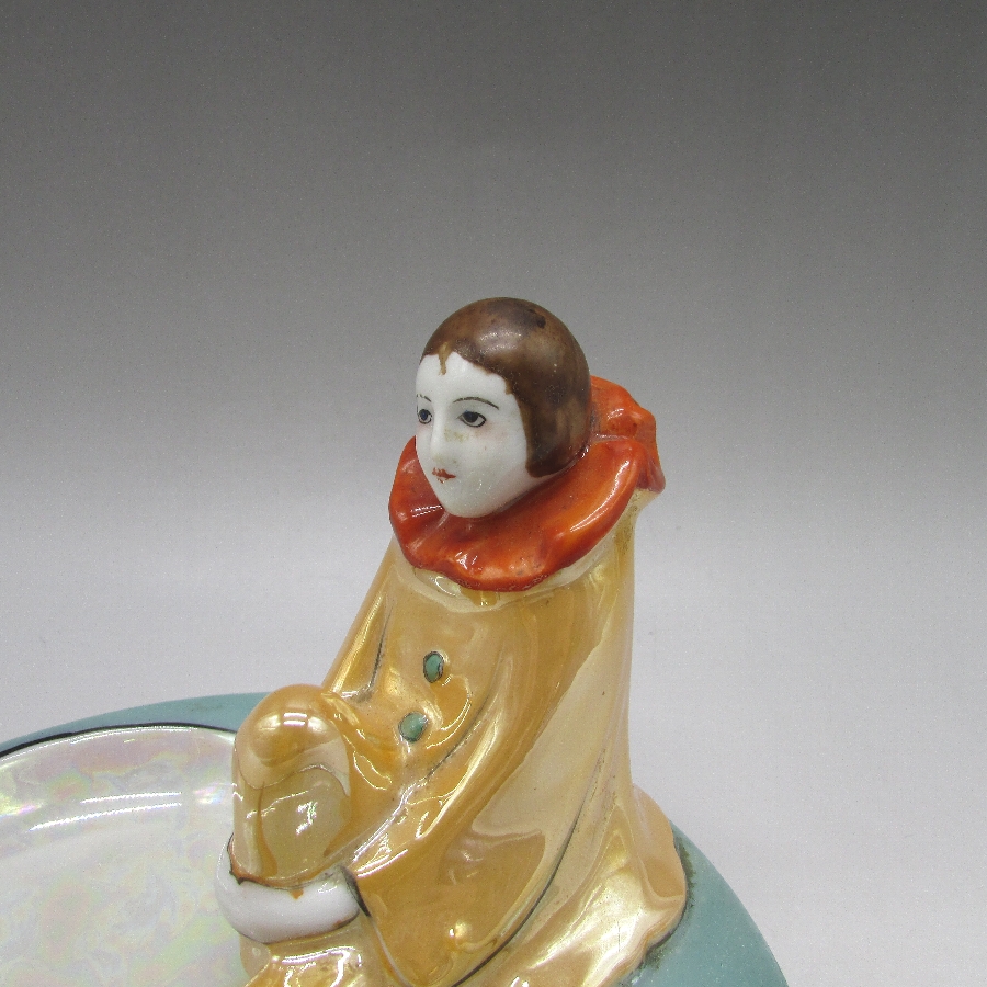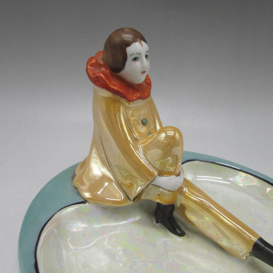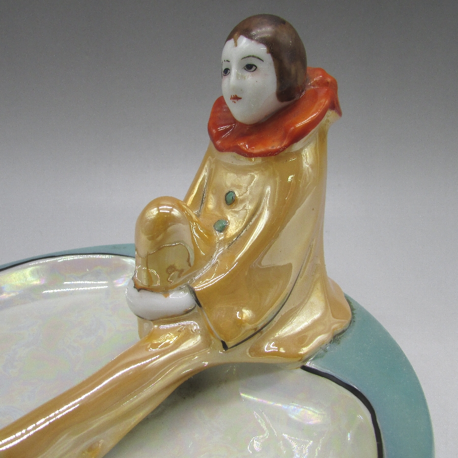 COLLECTIBLES A TO Z」(David Spain/1997・Schiffer Book)に同作品が掲載されていいます。ピエロ(ピエレッテ)はイタリアの喜劇から生まれた幻術性とアメリカのポップなカルチャーが融和したデザインを日本人によって作陶された異文化の集合体です。明治時代の輸出陶磁器には全く出てこなかったが、アールデコ期に突如登場し、代表的なキャラクターとなりました。当時、フランスで大流行したロシア・バレエ団の影響があったと思われます。アールデコの特徴を最も魅力的に表現していて、コレクターズアイテムとして不動の地位にあります。アールデコは1925年にフランスのパリで開催された現代装飾産業美術国際博覧会によって呼ばれるようになった装飾様式です。東洋美術などの芸術的要素を取り入れた直線と立体のシンプルかつ合理的な機能美あるデザインで、明るく・鮮やかな色彩が特徴的です。ノリタケのアール・デコのデザインは1919年に英国人デザイナーの「シリル・シー」が入社してから本格的に始まりました。ノリタケ・アール・デコの制作は1920年頃から1929年の世界恐慌までのわずか10年間程度の制作期間しかなく、未だにその全貌は明らかにされていません。