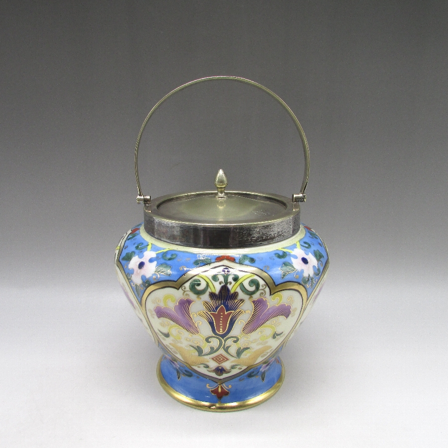 オールドノリタケの唐草文様ビスケットジャーです。1906年頃~1925年頃にイギリスに輸出され、約100年の時を経て日本に里帰りしてきました。オールドノリタケは現在のノリタケカンパニーが明治末期から戦前までに製造したアンティーク陶磁器の総称です。豪華絢爛な西洋風絵付け陶磁器は海外で人気を博しました。近年では、約100年という長い歳月を経て日本に里帰りしてきたことで、わが国でも大変人気が高くなっており、美術工芸品として高い地位を確保しつつあります。