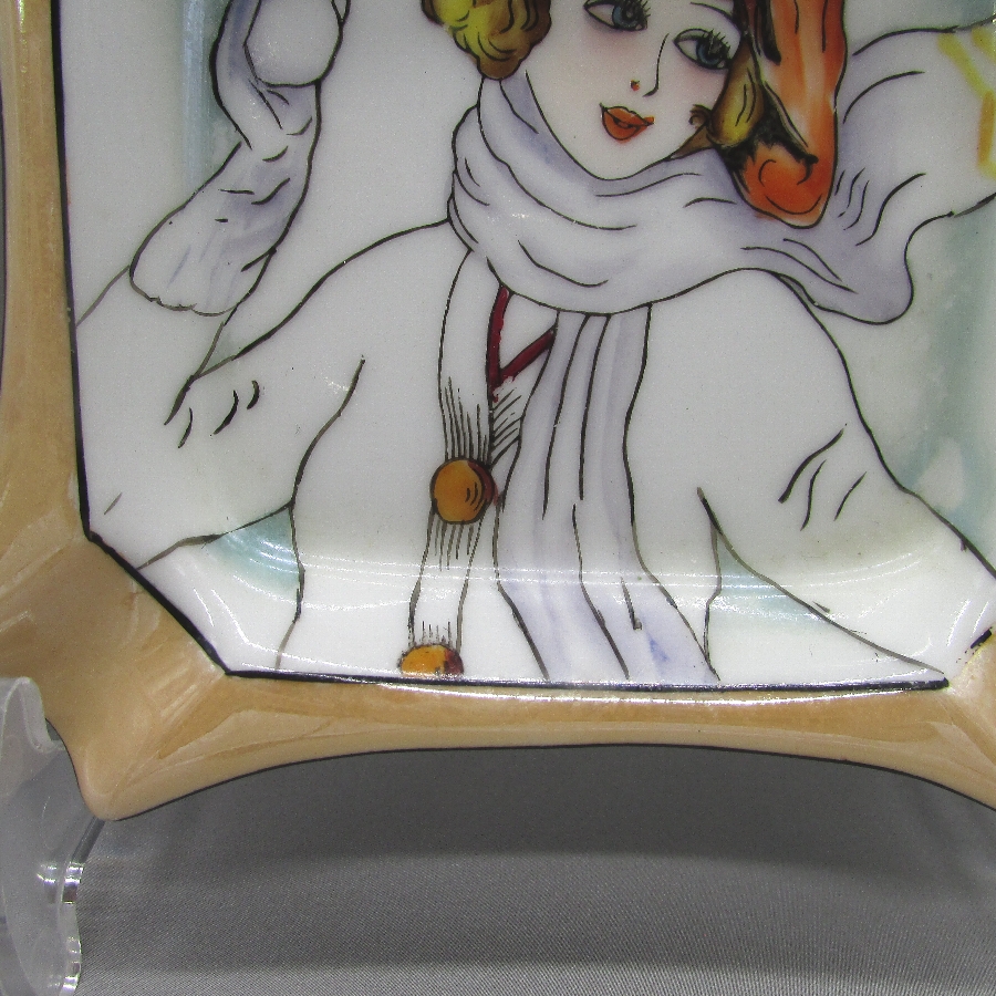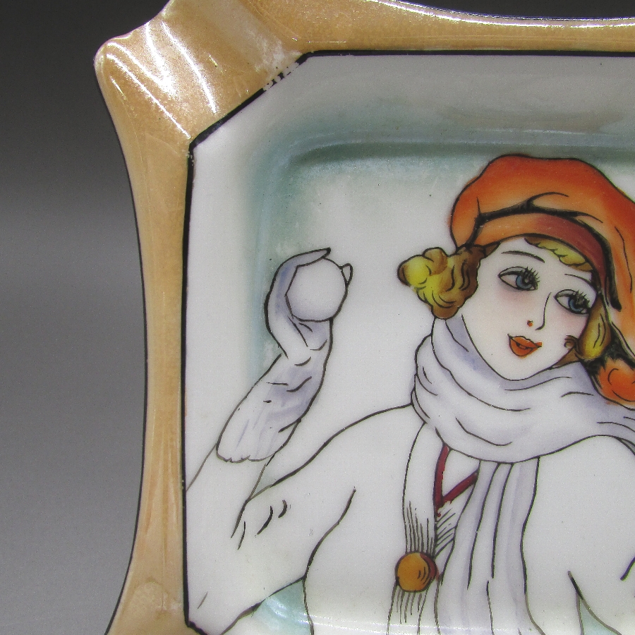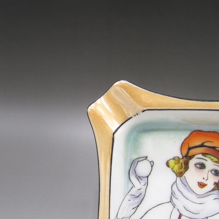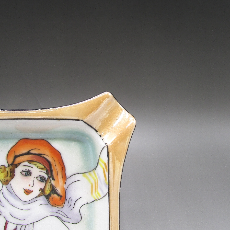 オールドノリタケのデコレディアッシュトレーです。1906年頃~1925年頃にイギリスに輸出され、約100年の時を経て日本に里帰りしてきました。アールデコ時代に流行した貴婦人をモティーフにした作品です。「愛らしく、明るい雰囲気」が特徴的で、特に人気の高いシリーズで「デコレディ」と呼ばれています。「Collecting
