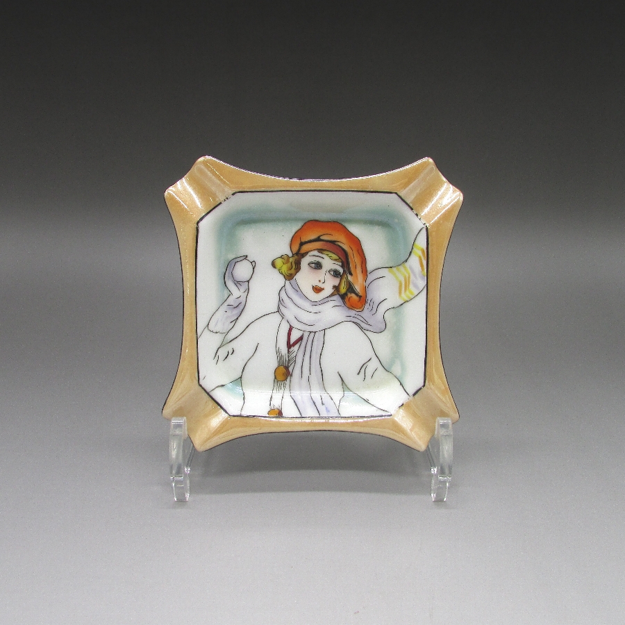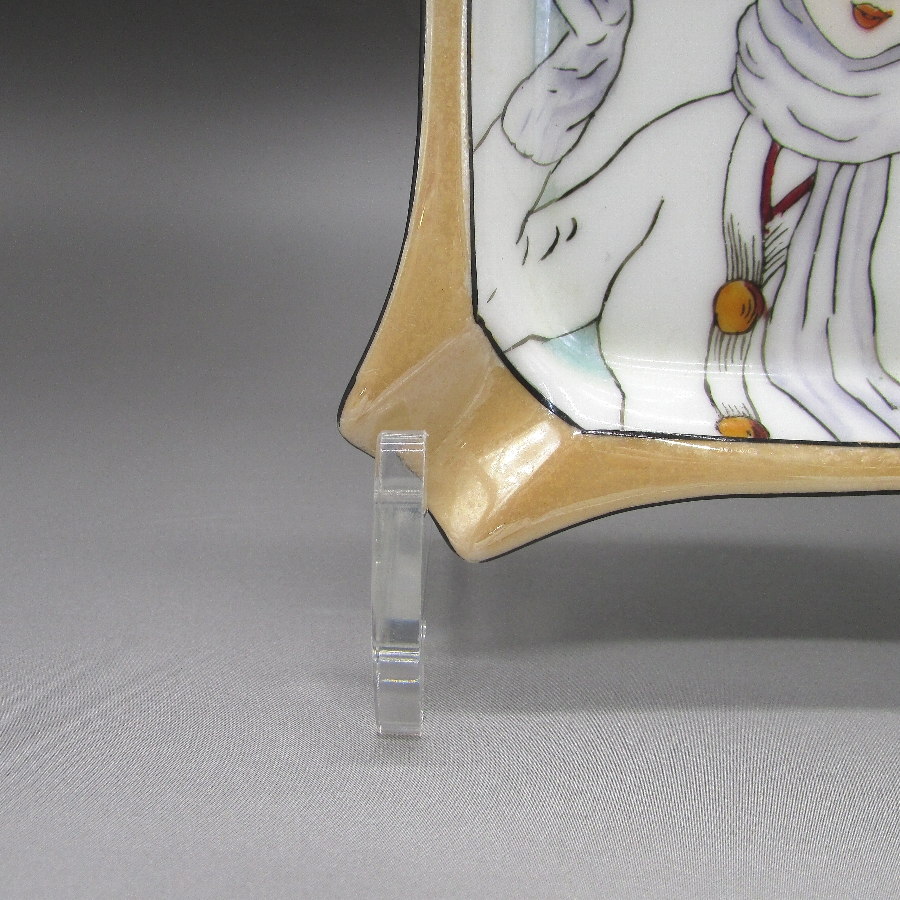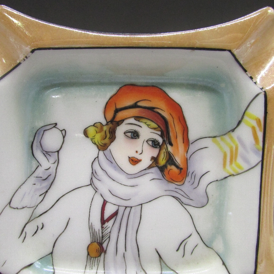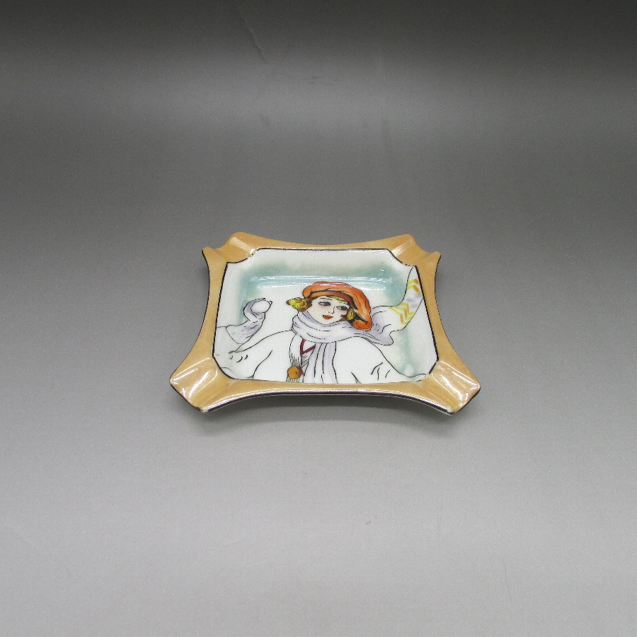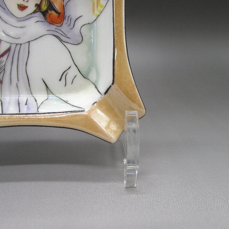 オールドノリタケのデコレディアッシュトレーです。1906年頃~1925年頃にイギリスに輸出され、約100年の時を経て日本に里帰りしてきました。アールデコ時代に流行した貴婦人をモティーフにした作品です。「愛らしく、明るい雰囲気」が特徴的で、特に人気の高いシリーズで「デコレディ」と呼ばれています。「Collecting